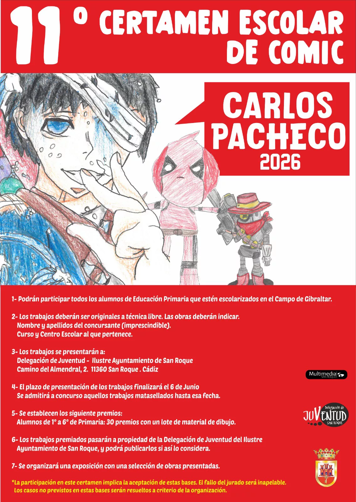 La Delegación de Juventud, que dirige el teniente de alcalde David Ramos, convoca el XI Certamen Escolar de Cómic Carlos Pacheco, en el que pueden participar alumnos de Primero a Sexto de Primaria del Campo de Gibraltar. El plazo de presentación de trabajos finaliza el 6 de junio de 2026. Se concederán 30 premios, consistentes en lotes de material de dibujo, y se organizará una exposición con las obras más destacadas.