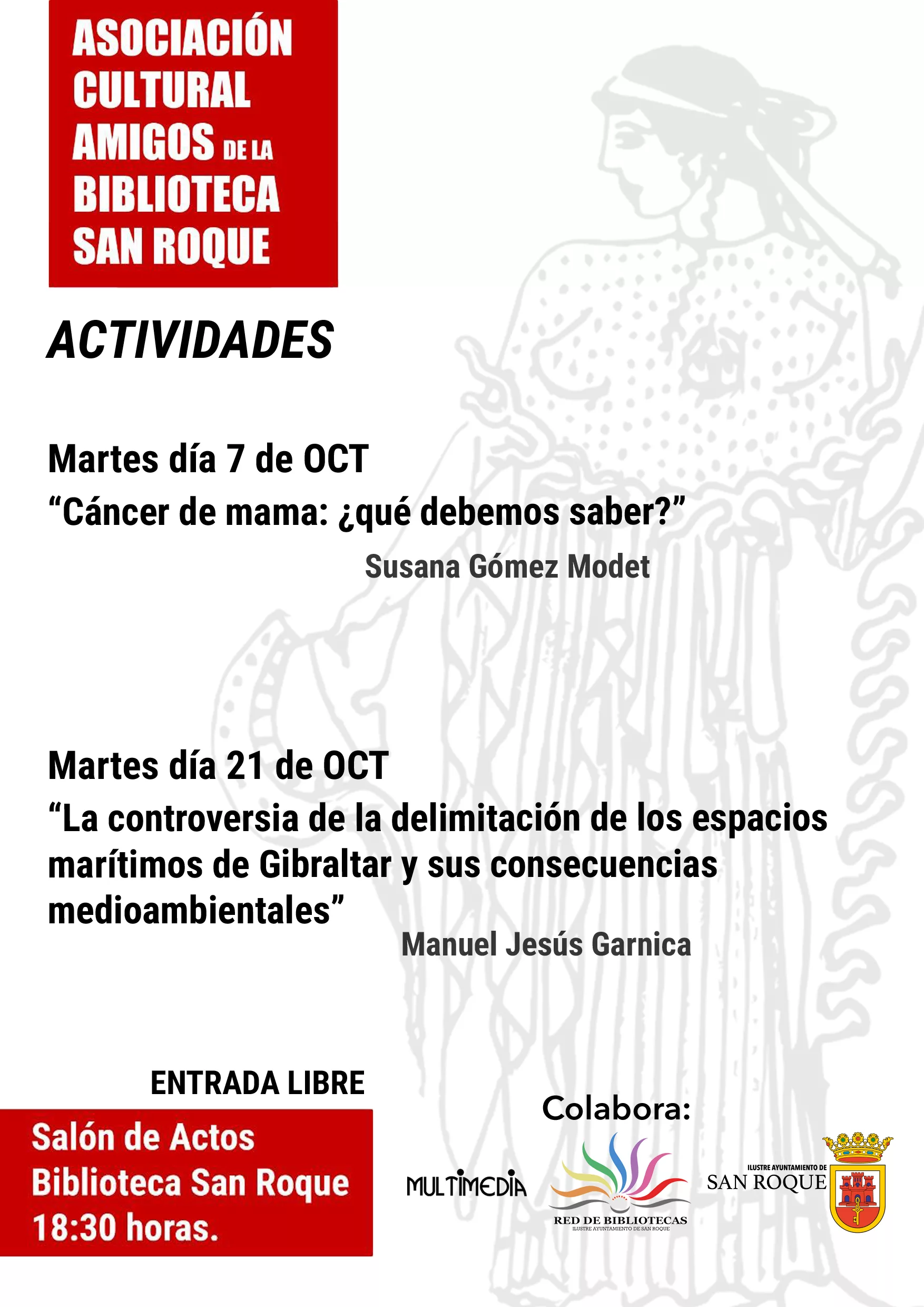 La Red Municipal de Bibliotecas, que dirige la concejal Rocío Fernández, y la empresa municipal Multimedia colaboran con la Asociación Amigos de la Biblioteca de San Roque en las distintas actividades gratuitas que realiza este colectivo. Para el mes de octubre se han programado dos: el día 7, una charla sobre la información que se ofrece sobre el cáncer de mama y, el día 21, otra sobre la controversia de la delimitación de las aguas en Gibraltar. Ambas actividades se darán a las 18.00 horas en el salón de actos de la Biblioteca de San Roque, en el edificio Diego Salinas.