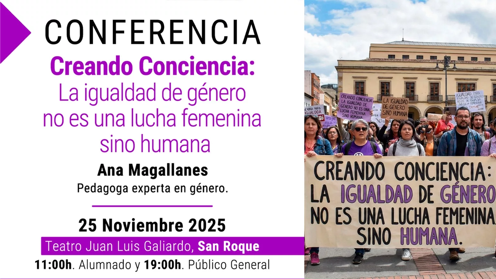 A las 11:00 horas, se contará con la ponencia en el teatro Juan Luis Galiardo de la pedagoga experta en género Ana Magallanes, dirigida a los alumnos de 3º,4º de la ESO y 1º de bachillerato de los IES de San Roque. Por la tarde, a las 19:00 horas, y para el público en general Ana Magallanes impartirá una nueva ponencia.