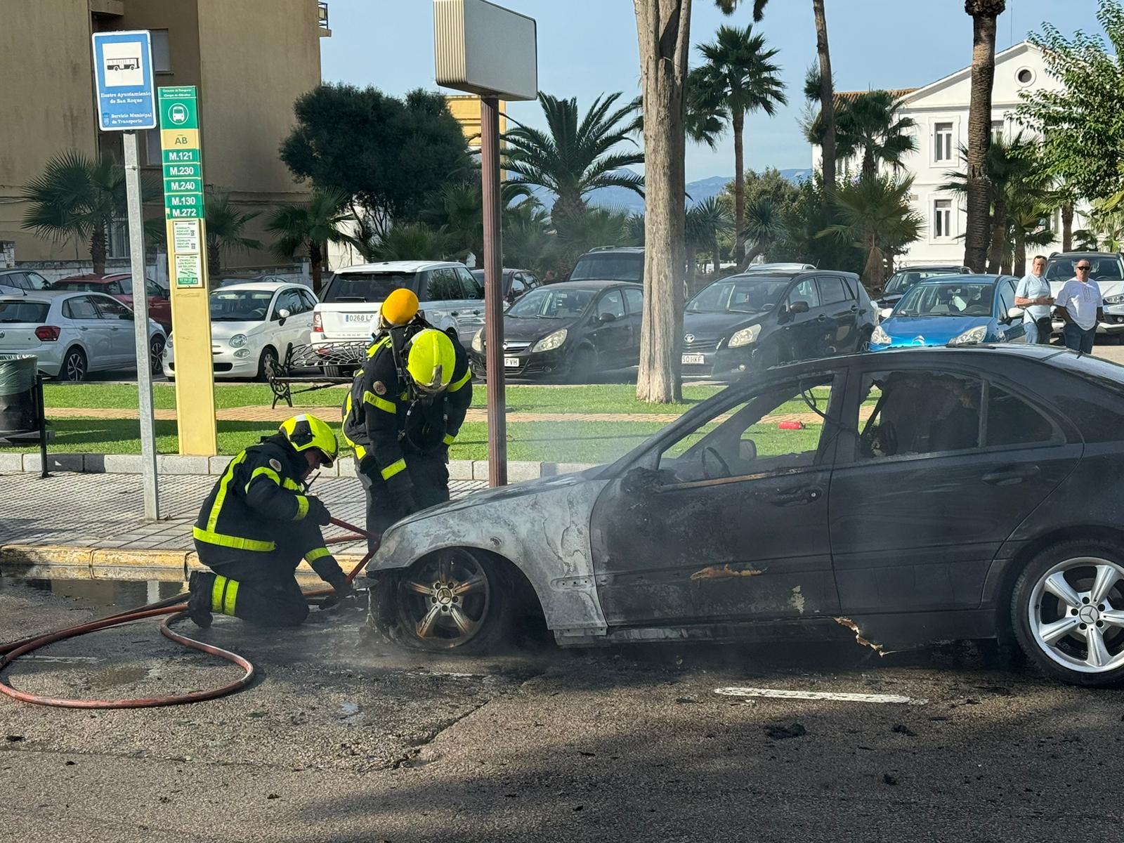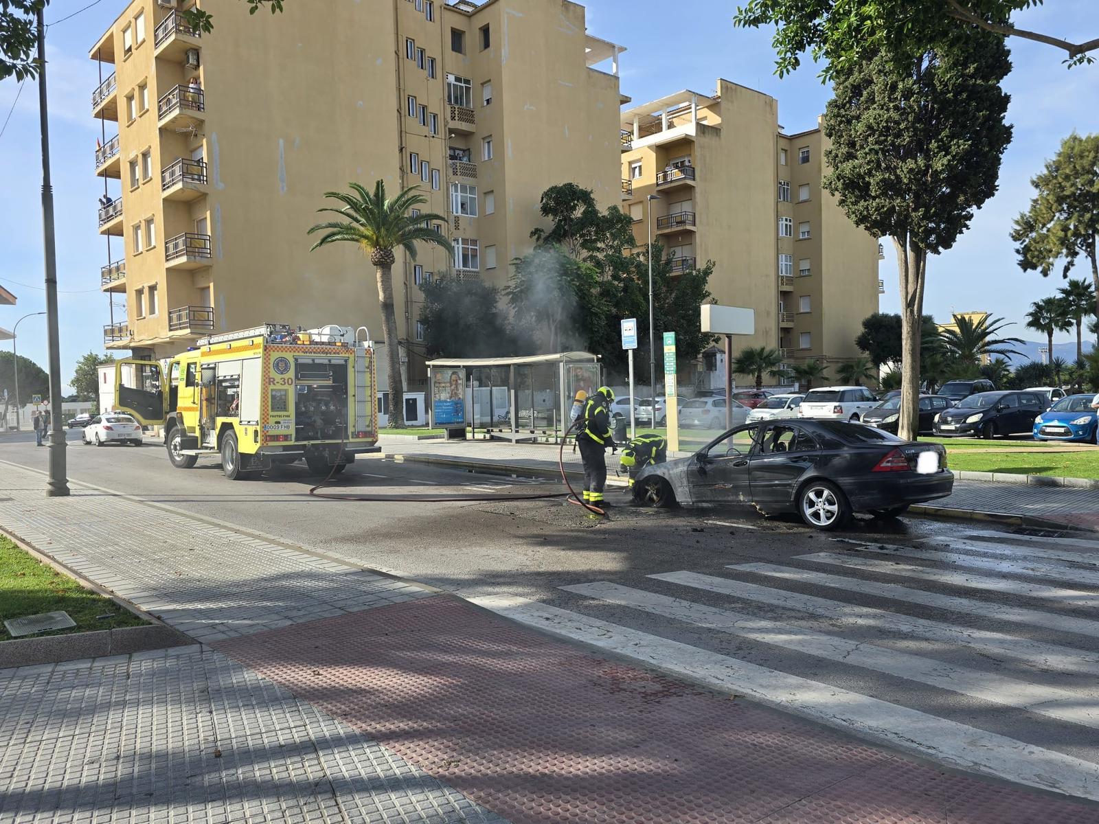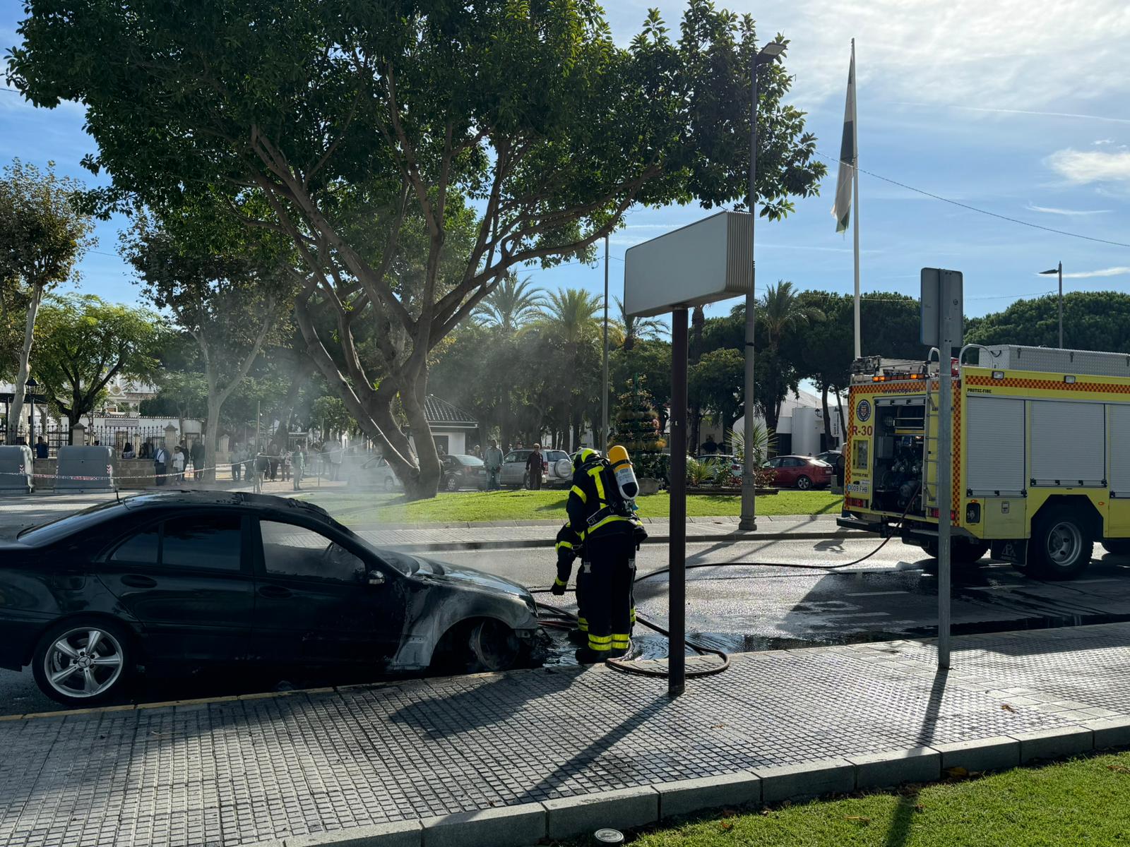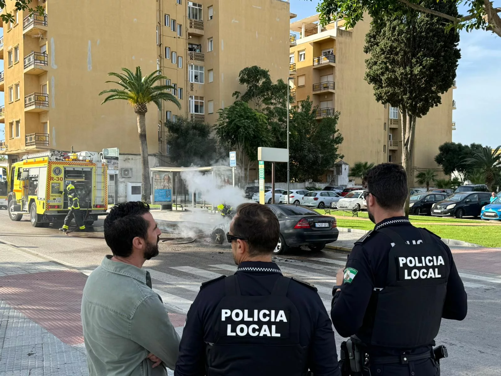 La Policía Local de San Roque, una dotación del consorcio de bomberos y la Guardia Civil han actuado esta mañana en el incendio de un vehículo en la zona de la Alameda de San Roque, el incendio del que se desconoce su origen se produjo cuando el vehículo circulaba los la carretera frente a la Alameda de Alfonso XI.