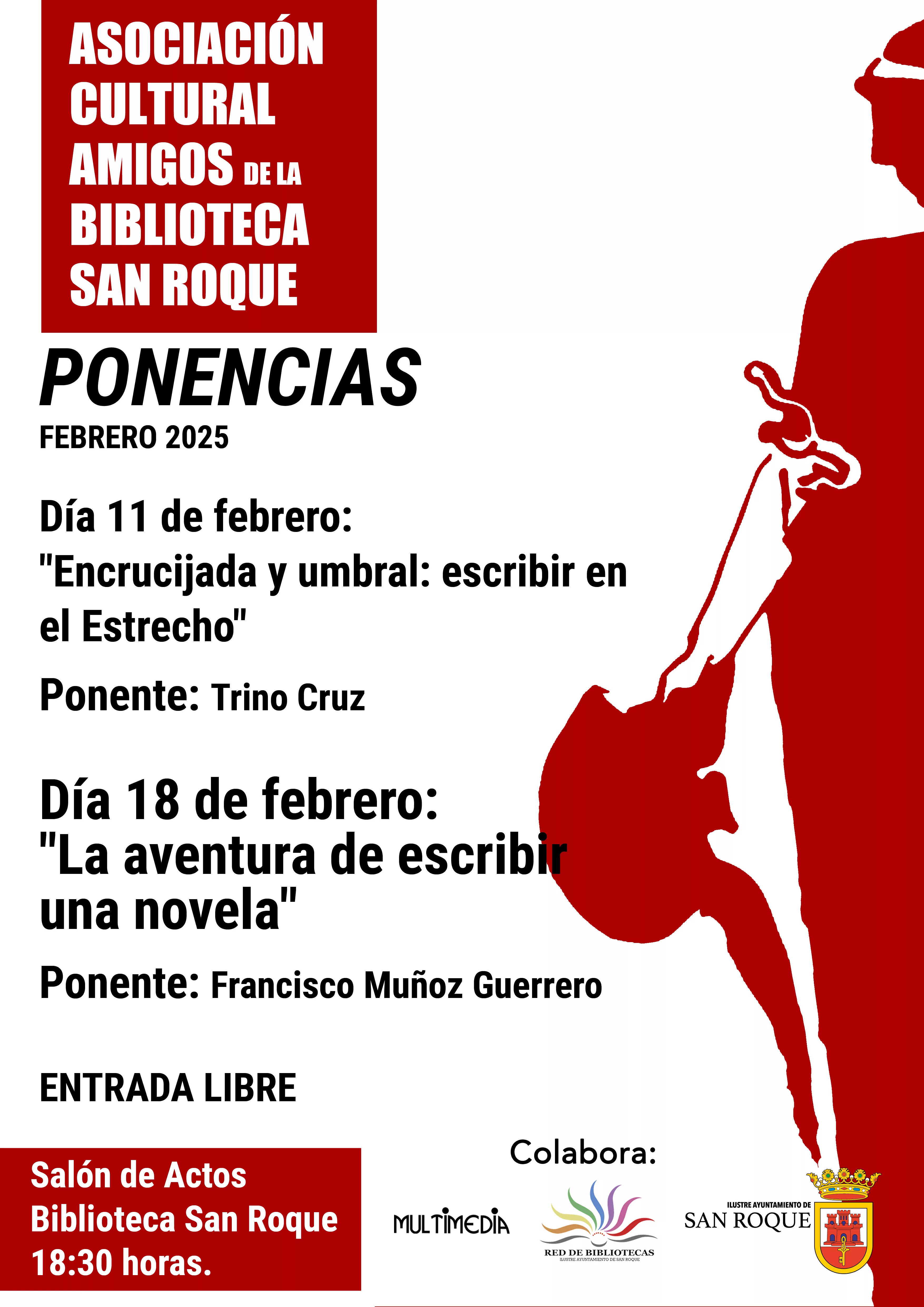 La Asociación Amigos de la Biblioteca de San Roque organiza para el mes de febrero dos ponencias de claro carácter literario. La primera será el próximo martes 11 en el Edificio Diego Salinas, a cargo del escritor Trino Cruz, mientras que la segunda tendrá lugar el día 18, y el ponente será el sanroqueño Francisco Muñoz Guerrero.