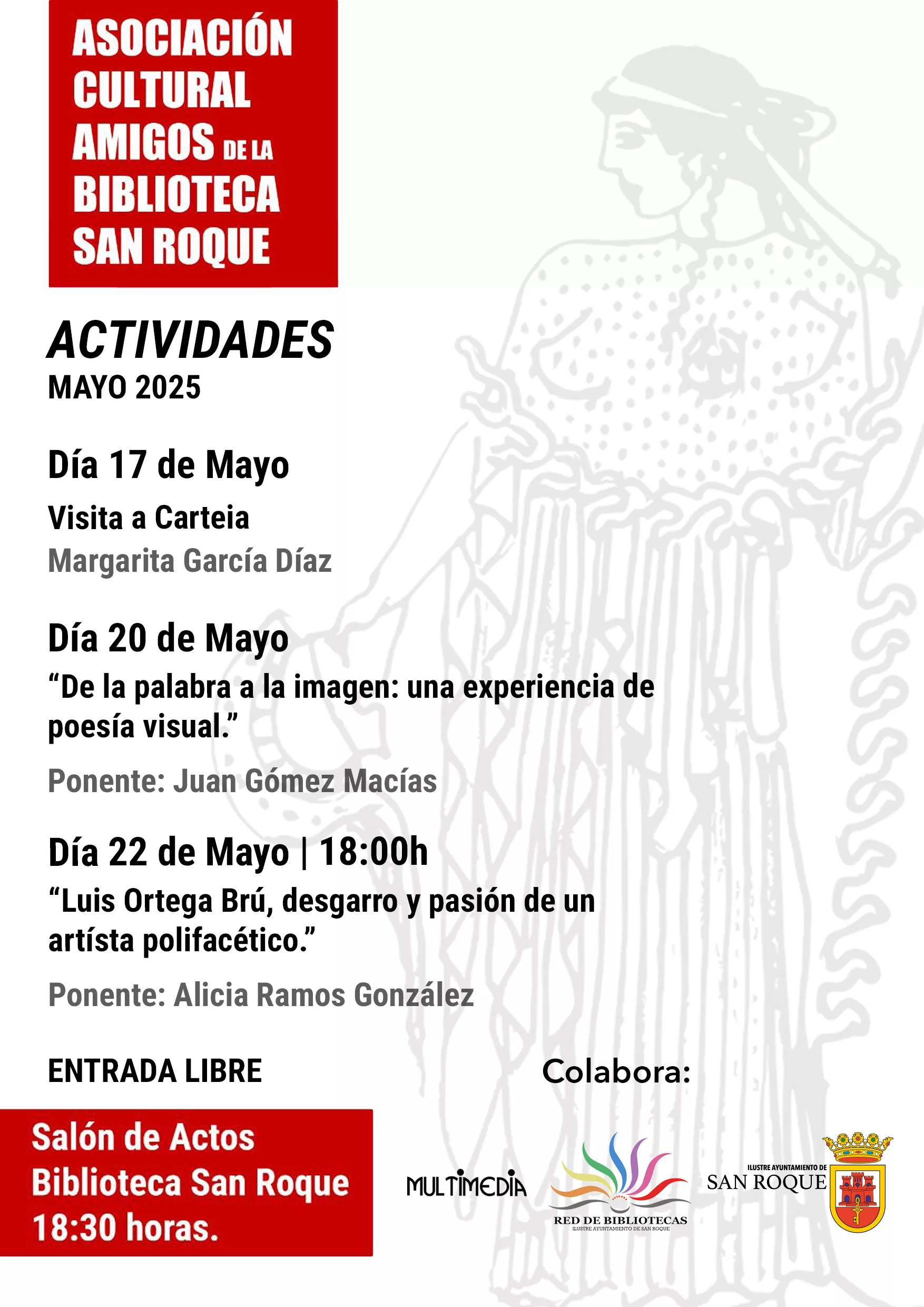 La Red Municipal de Bibliotecas, que dirige la concejal Rocío Fernández, y la empresa municipal Multimedia colaboran con la Asociación Amigos de la Biblioteca de San Roque en las distintas actividades gratuitas que realiza este colectivo. Para el mes de mayo se han programado tres: una visita a Carteia el día 17; una conferencia de Juan Gómez Macías, el martes 20; y otra charla, esta vez sobre Ortega Brú, el jueves 22.
