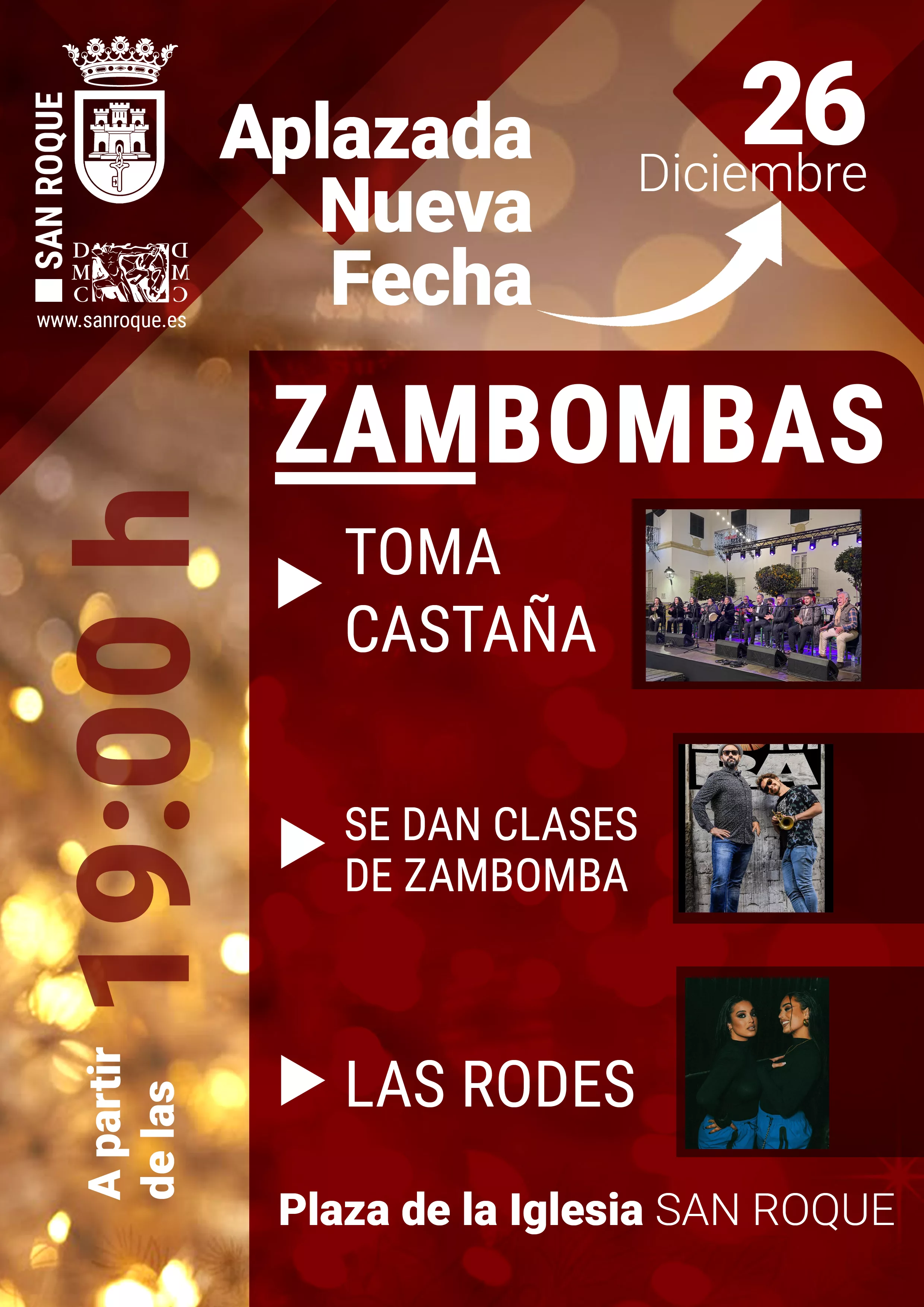 Ante la previsión de lluvias para la noche de este viernes, desde el Ayuntamiento de San Roque se ha decidido aplazar la Zambomba Navideña de la Plaza de la Iglesia para el próximo viernes 26 de diciembre a las 19.00 horas. Actuarán los grupos Toma Castaña, Se Dan Clases de Zambomba y Las Rodes.