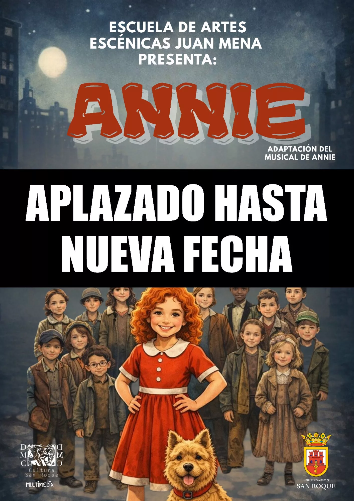 Los grupos infantil y de adultos de la Escuela de Artes Escénicas Juan Mena iban a representar este domingo a mediodía en el Teatro Juan Luis Galiardo la obra musical “Annie”. Sin embargo, se ha decidido suspender esa función y aplazarla hasta nueva fecha debido a la previsión de mal tiempo para esa jornada.