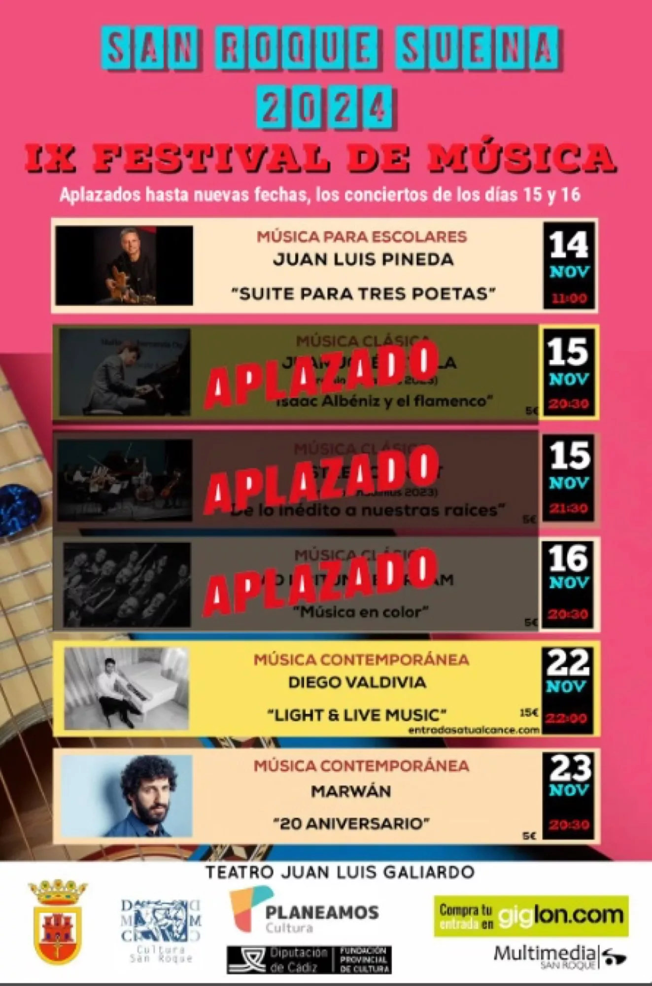 Los conciertos del Festival «San Roque Suena» de los días 15 y 16 de noviembre han quedado aplazados hasta nuevas fechas, que serán anunciadas próximamente. En concreto, se trata de la doble sesión del viernes 15 en el teatro Juan Luis Galiardo compuesta por la actuación del pianista Juan José Sevilla, Premio Andalmus 2023 de jóvenes intérpretes andaluces y la actuación de la formación malagueña de piano y cuerda Astrea Quintet, con su concierto titulado “De lo inédito a nuestras raíces”, que también obtuvo el Premio Andalmus 2023.