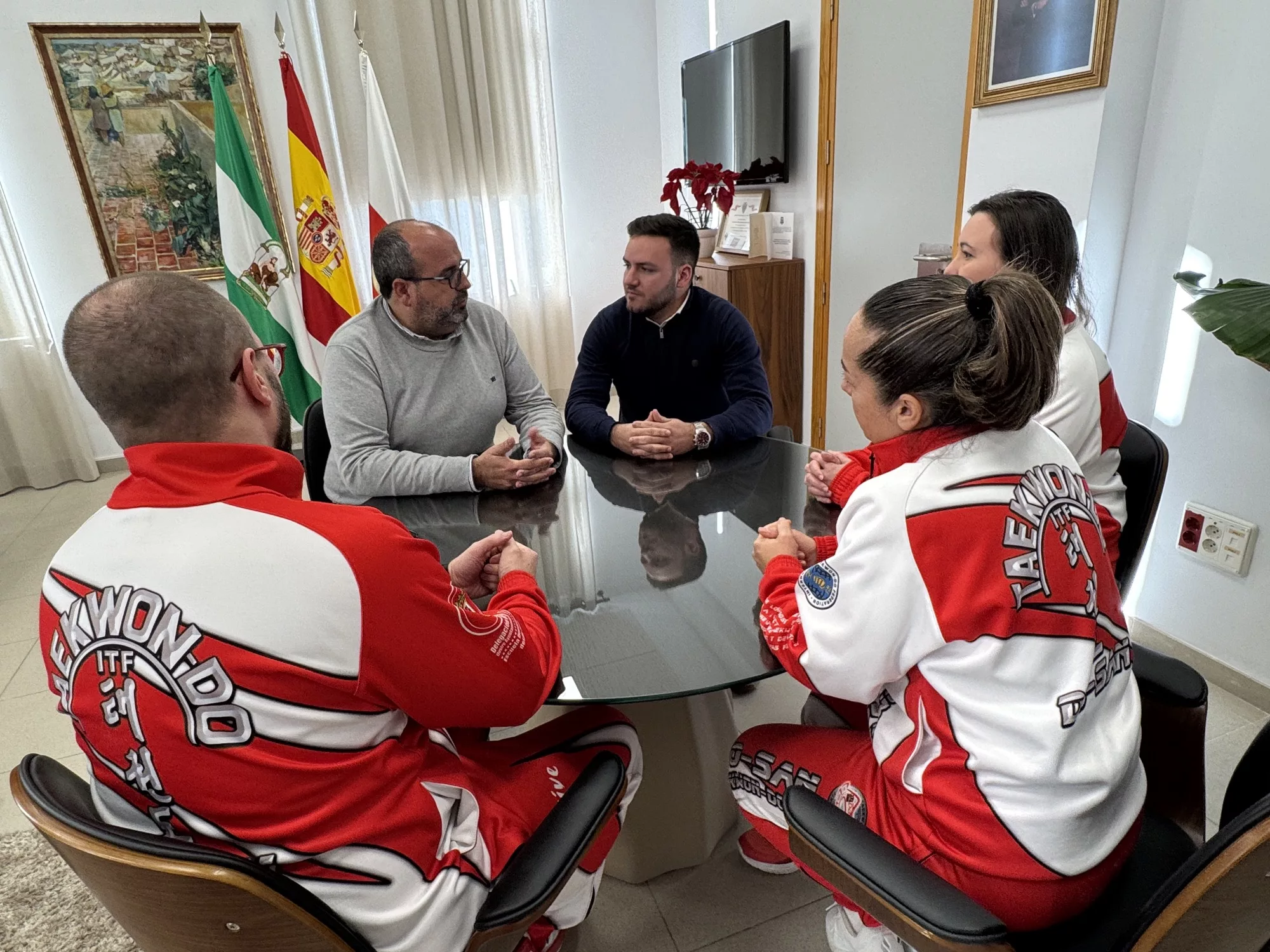 El alcalde accidental de San Roque, Óscar Ledesma, junto al teniente de alcalde de Deportes, Fernando Vega, han recibido a los responsables del club de taekwondo Do San.