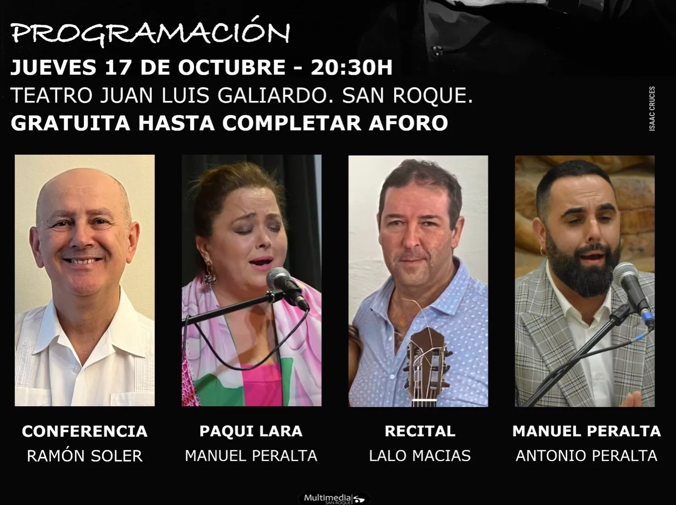 Respecto a Paqui Lara, se trata de una cantaora sanroqueña que hace unos años retomó su carrera musical con gran éxito, y que contará en el Teatro con el acompañamiento de su amigo el guitarrista Manuel Peralta. El mismo Peralta ofrecerá además su faceta como cantaor, y le acompañará al toque su hermano “El Cuco”. En cuanto a Lalo Macías, es un guitarrista sanroqueño de gran trayectoria.