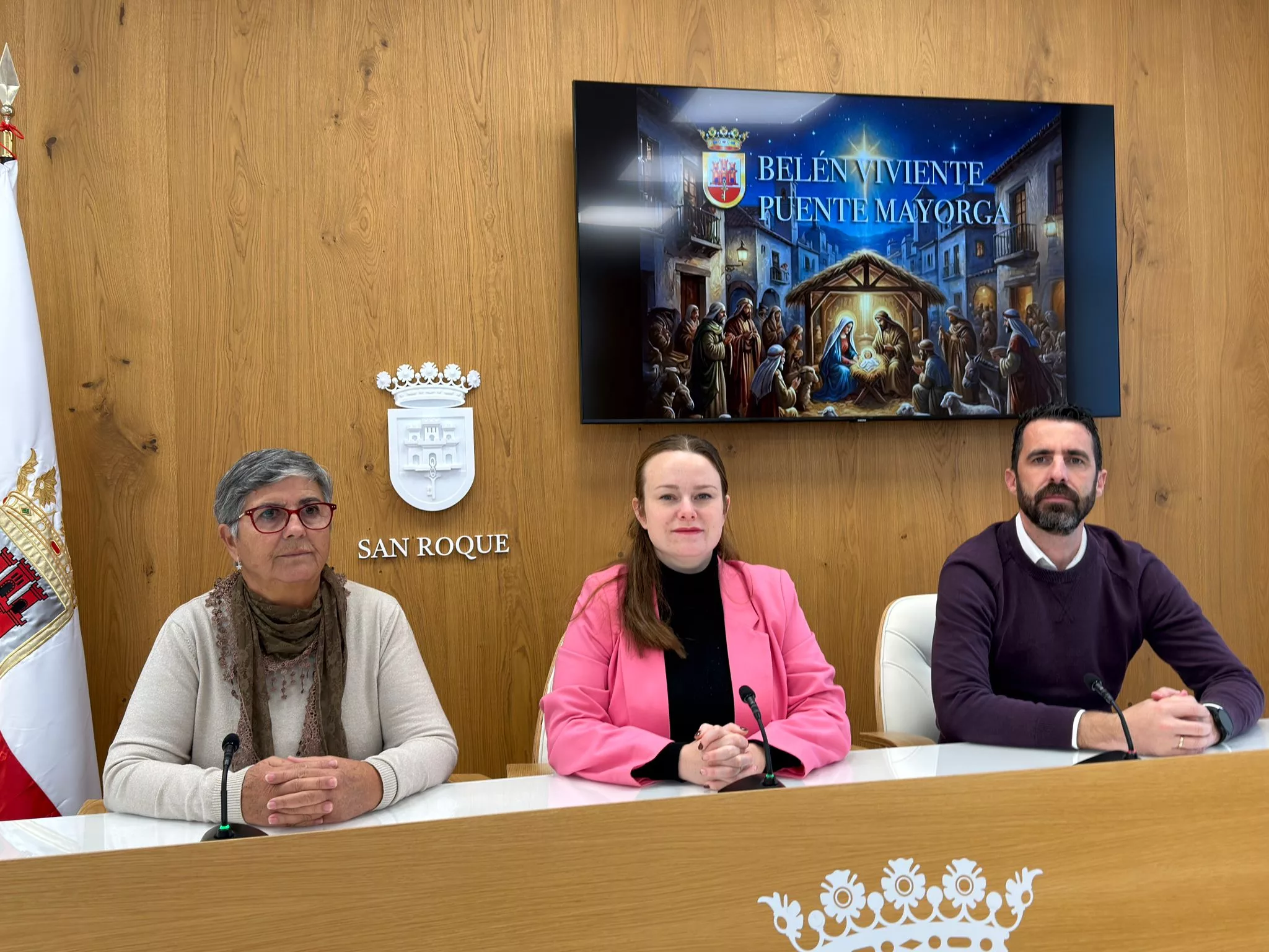 La concejal de Participación Ciudadana, Rocío Fernández, junto al teniente de alcalde de la Bahía, David Ramos, y la representante de la Comisión de Fiestas, María Jesús García Illescas, han presentado las actividades que se van a desarrollar en esta séptima edición del Belén Viviente de esta barriada.