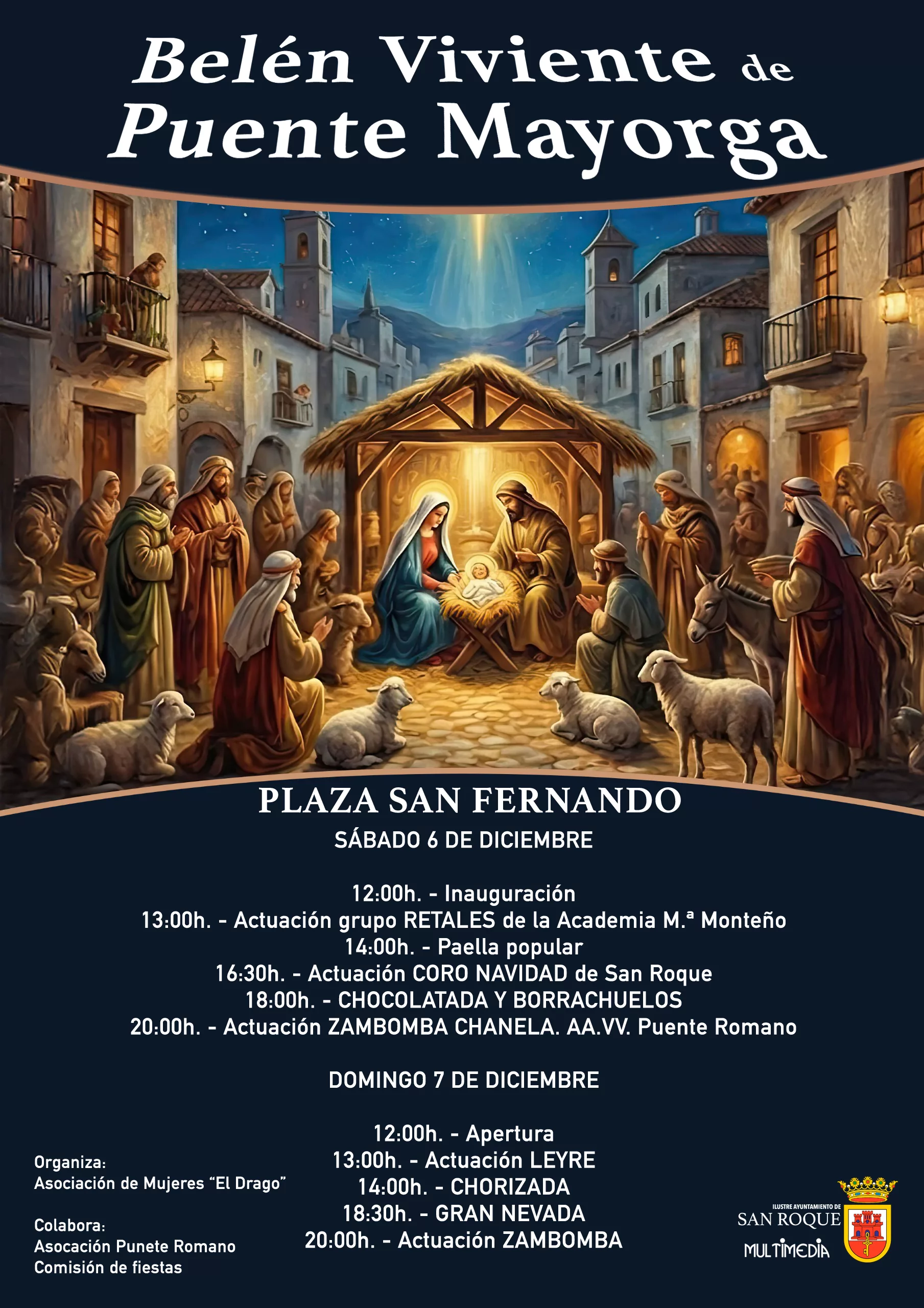 El Belén Viviente, que está organizado por la Asociación de Mujeres “El Drago”, y cuenta con la colaboración de la Asociación de Vecinos “Puente Romano”, la comisión de fiestas de la barriada y colectivos de la zona, además del Ayuntamiento de San Roque a través de la delegación de Participación Ciudadana, tendrá como escenarios la Plaza San Fernando y la calle Joaquín Costa.