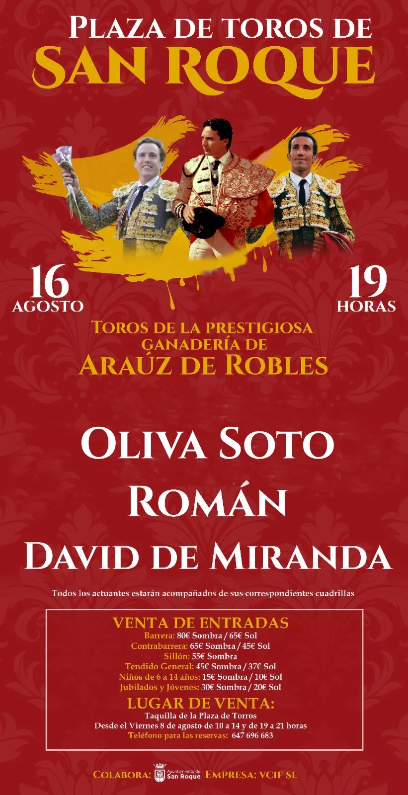 La empresa VCIF SL ha comunicado que se ha producido un cambio en el cartel de la Corrida de Toros de la Feria Real de San Roque, que tendrá lugar el próximo sábado a las 19 horas en el centenario coso sanroqueño. Ante la imposibilidad de que el novillero malagueño Curro Márquez pueda torear el sábado, se incorpora al cartel el matador sevillano Oliva Soto, que acompañará a los diestros Román y David de Miranda. Los tres lidiarán seis toros de la ganadería jiennense de Araúz de Robles.