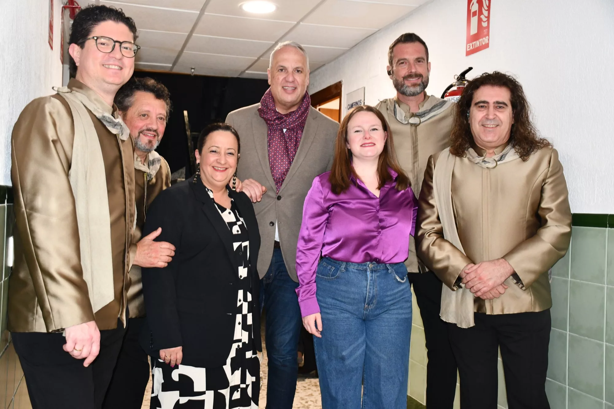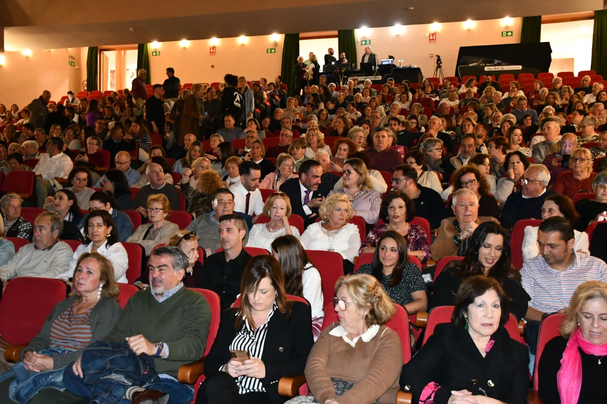 El alcalde de San Roque, Juan Carlos Ruiz Boix, junto a la teniente alcalde de Tradiciones, María del Mar Collado, y la edil, Rocío Fernández, han saludo a los componentes de Cantores de Híspalis, momentos antes del inicio del espectáculo en el teatro Juan Luis Galiardo.