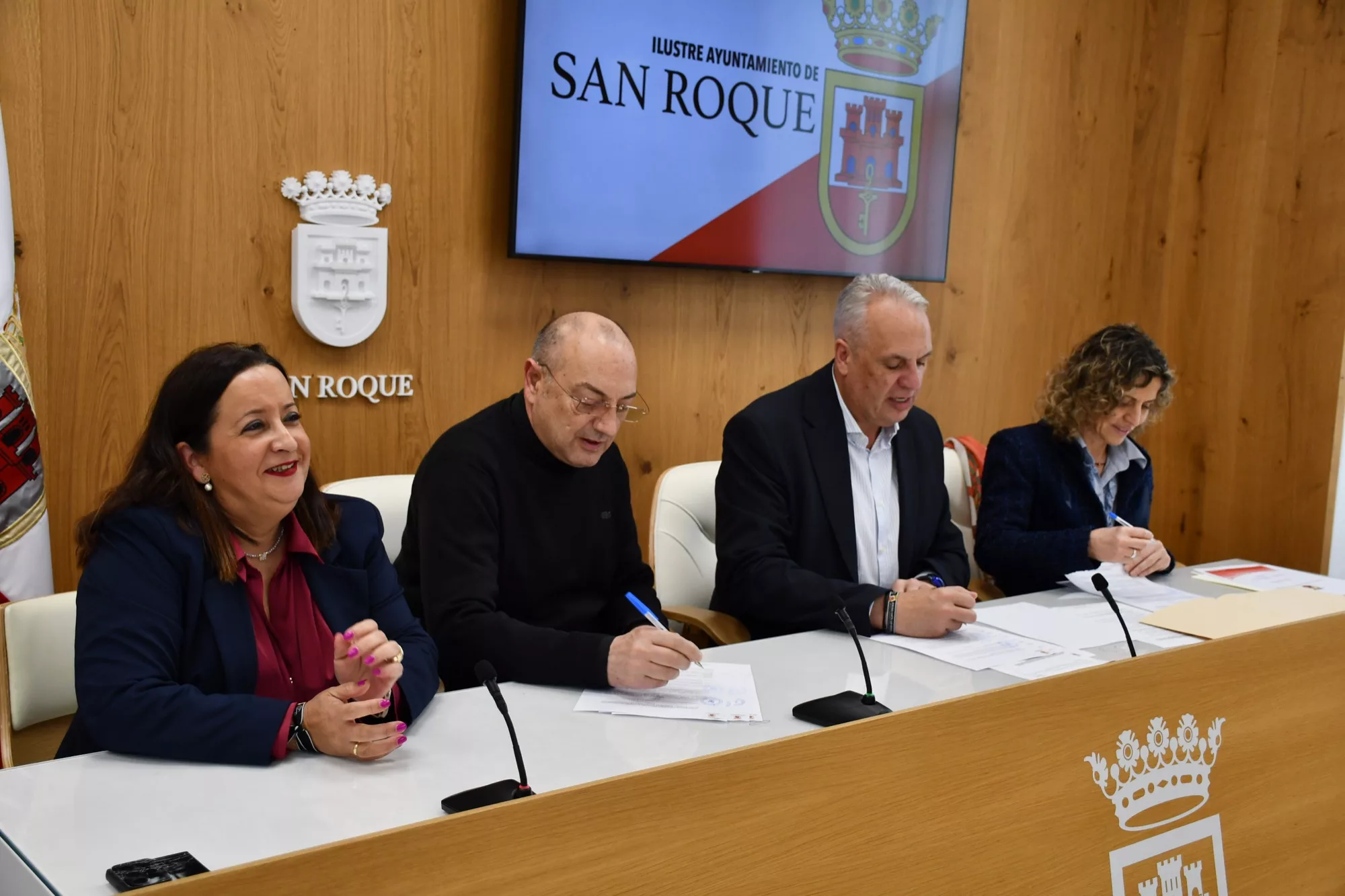 El alcalde de San Roque, Juan Carlos Ruiz Boix, junto a la teniente de alcalde de Tradiciones, María del Mar Collado, y en presencia de la secretaria, Ana Núñez de Cossío, ha firmado un convenio de colaboración con la Parroquia de La Inmaculada de Campamento para la realización del Vía Crucis, el próximo 11 de abril.