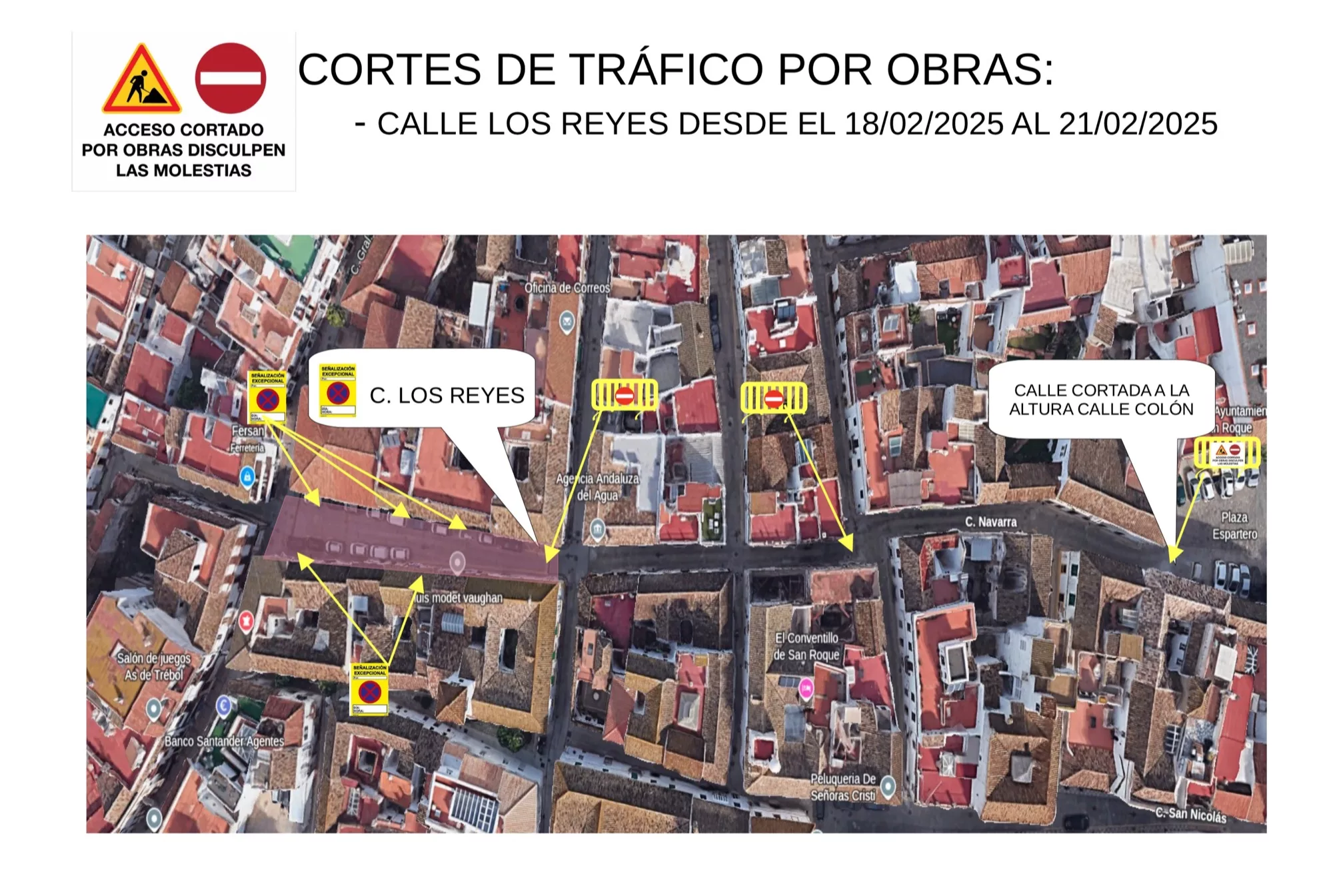 La calle Los Reyes permanecerá cerrada al tráfico desde el martes 18 hasta el viernes 21 de febrero debido a diversas obras que se están llevando a cabo en la citada vía. La delegación de Seguridad Ciudadana, dirigida por el teniente alcalde, David Ramos, ha informado de estos cortes de tráfico.