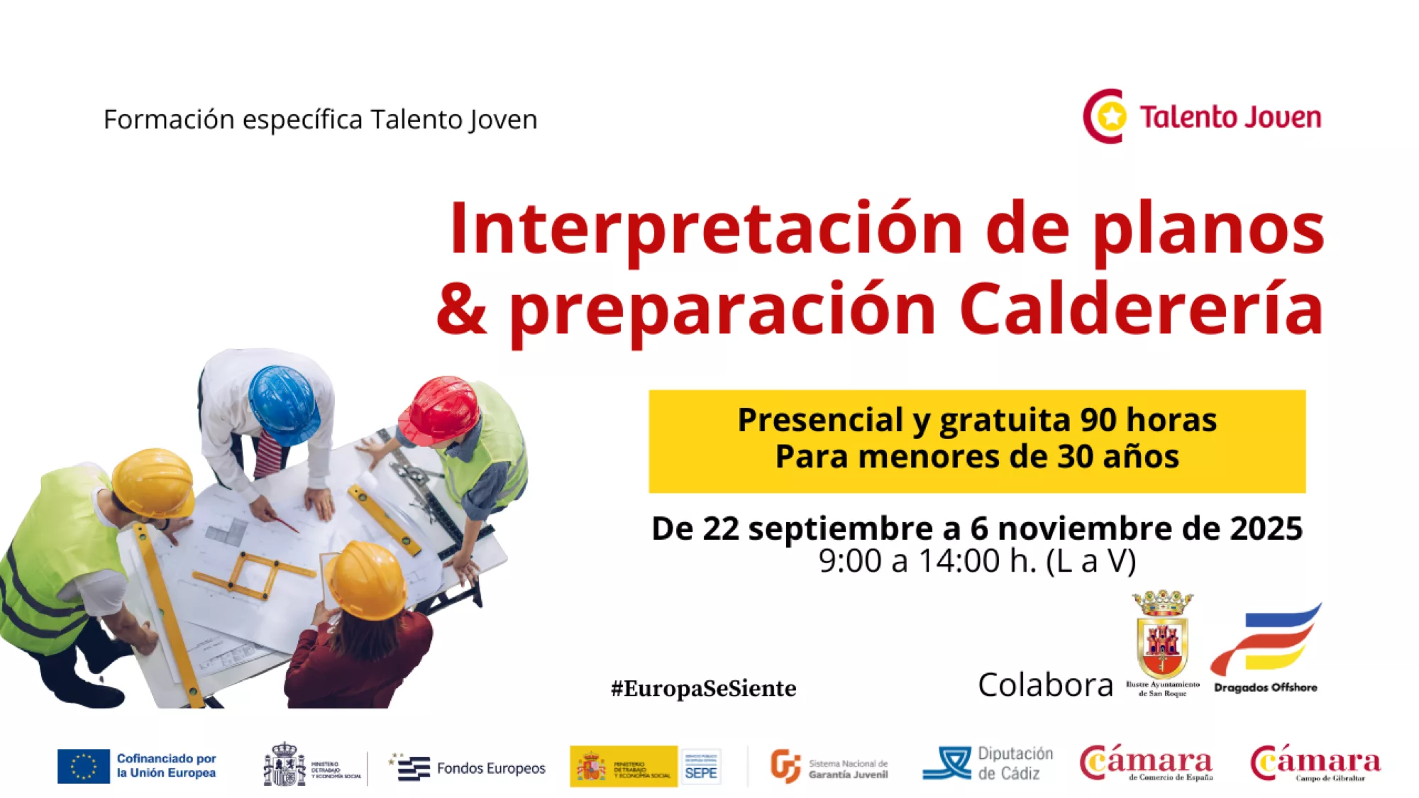 Los jóvenes inscritos en el programa Talento Joven podrán realizar un curso de Interpretación de Planos y Preparación de Calderería organizado por el Ayuntamiento de San Roque, la Cámara de Comercio y Dragados OffShore. Hay que recordar que esta empresa va a construir en Campamento plataformas para parques eólicos.