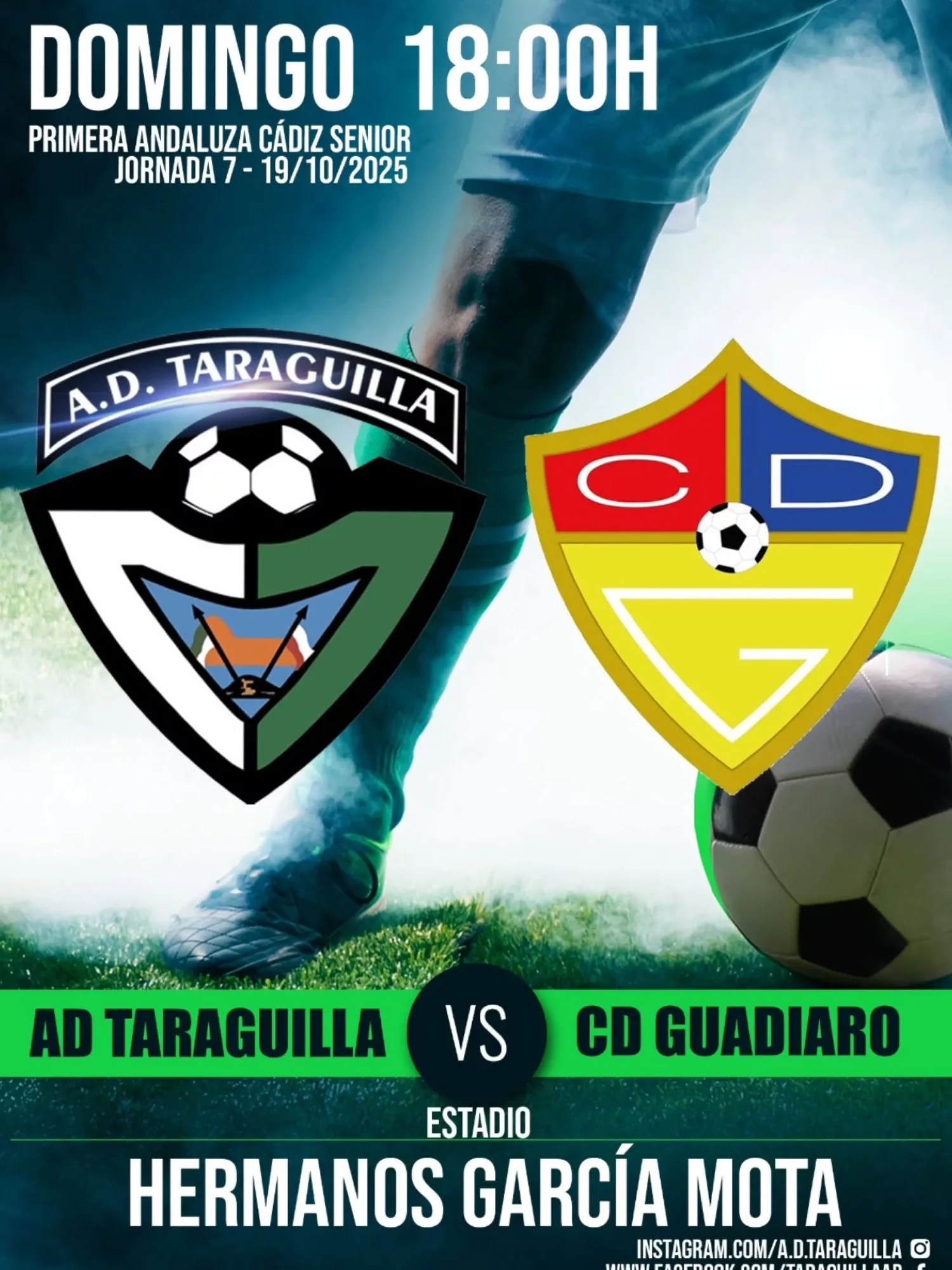 El Municipal Hermanos García Mota acogerá este domingo el derbi local entre los dos equipos sanroqueños de Primera Andaluza Cádiz: la Agrupación Deportiva Taraguilla y el Club Deportivo Guadiaro. El partido está previsto a partir de las 18.00 horas.