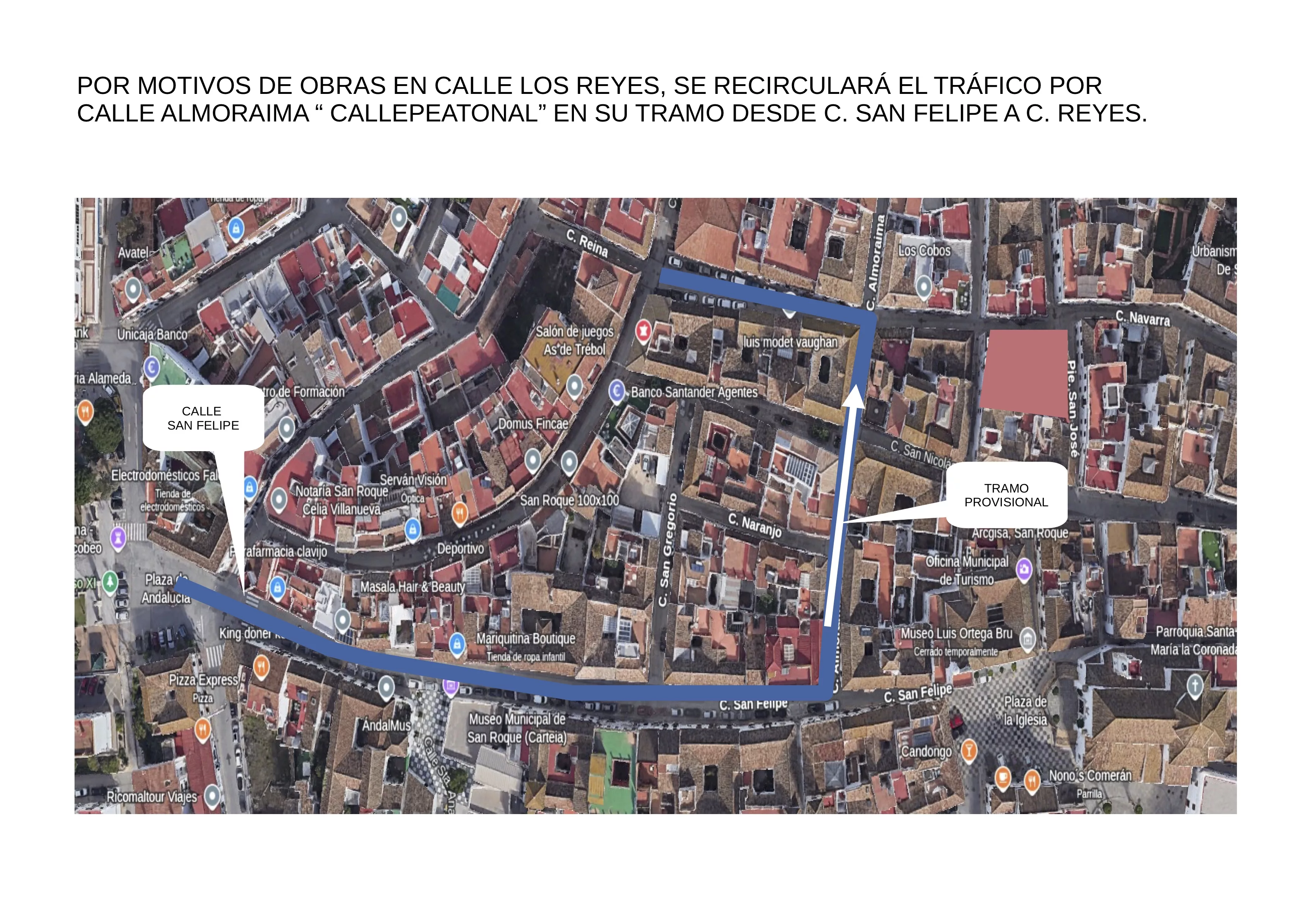 La delegación de Seguridad Ciudadana, dirigida por el teniente alcalde, David Ramos, ha informado de las modificaciones del tráfico que se van a llevar a cabo en el Casco Histórico de San Roque. Se trata de abrir a la circulación de vehículos parte de la calle Almoraima, vía peatonal, por un tramo provisional entre las calles San Felipe y Los Reyes, desde el miércoles 19 de marzo hasta la finalización de las obras.