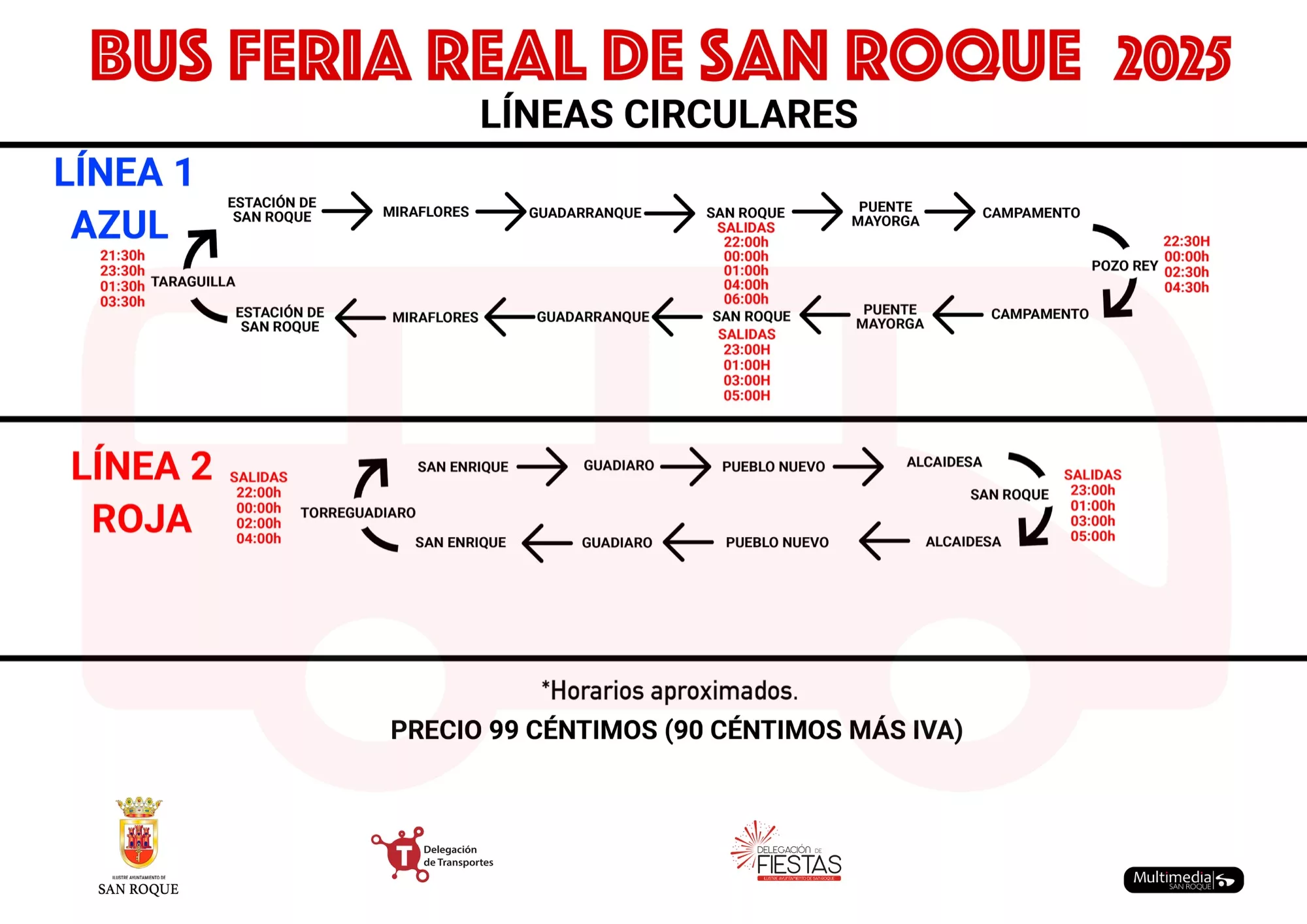 De esta manera, la Línea Azul enlazará la Alameda Alfonso XI con Taraguilla, Estación, Miraflores, Guadarranque, Puente Mayorga, Campamento y Pozo del Rey; mientras que la Línea Roja unirá San Roque Ciudad con Torreguadiaro, San Enrique, Guadiaro, Pueblo Nuevo y Alcaidesa. La frecuencia de paso de estos autobuses será de, aproximadamente, cada dos horas, con un precio de 99 céntimos el viaje, que supone 90 céntimos más IVA.