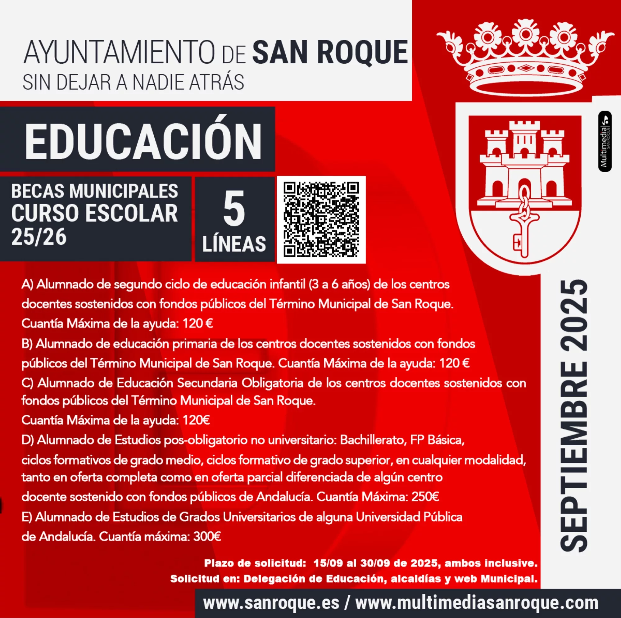 El próximo 15 de septiembre se inicia el plazo de presentación de solicitudes de las cinco líneas de becas para estudiantes sanroqueños durante el curso 2025/26. Con una partida de 120.000 euros, se incrementa en 20 euros de la cuantía de las ayudas a Infantil respecto al curso pasado.
