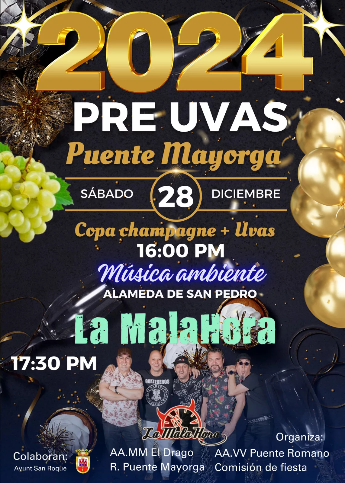 Así sobre las 8:00 de la tarde, aproximadamente, la Comisión de Fiestas, junto a la Asociación de Mujeres El Drago, la Asociación de Vecinos Puente Romano, y el Recreativo Puente Mayorga, organizadores del evento, facilitarán una copa de cava para brindar juntos, y caramelos, pasas y otros productos para tomarse las 12 Pre-uvas.