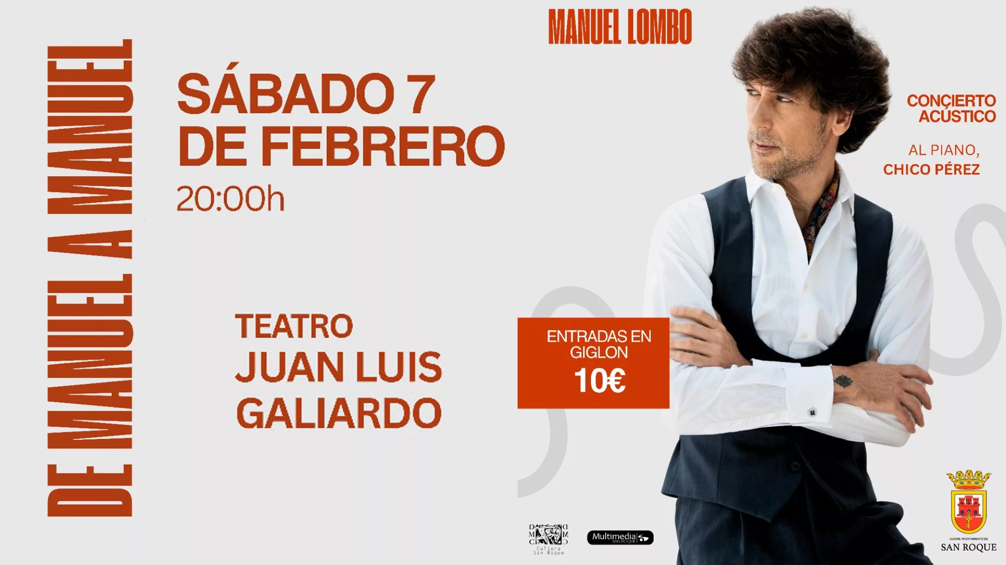 Aprovechando la buena acústica del Teatro Juan Luis Galiardo, el artista Manuel Lombo realizará en San Roque un concierto íntimo y cercano que podrán aprovechar sus seguidores y amantes de la música en general. Actuará acompañado al piano por Chico Pérez y, bajo el título de “Manuel a Manuel”, cantará letras del legendario Manuel Alejandro.