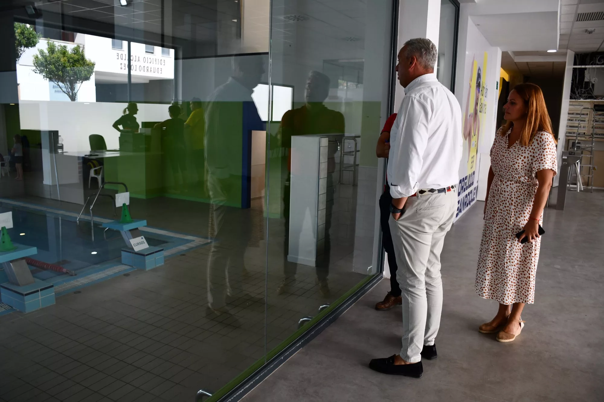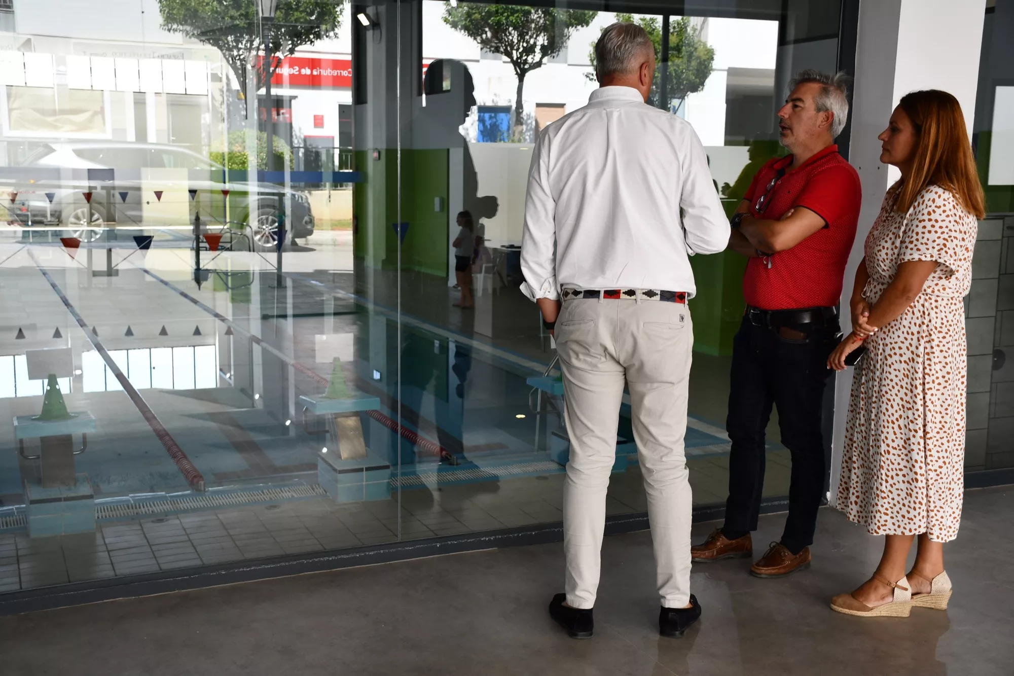 El alcalde de San Roque, Juan Carlos Ruiz Boix, junto a la teniente de alcalde de Deportes, Mónica Córdoba, han visitado esta mañana de lunes la piscina municipal, día en que se retoman los servicios en esta instalación municipal, tras proceder al secuestro temporal de la concesión del servicio de la piscina municipal.