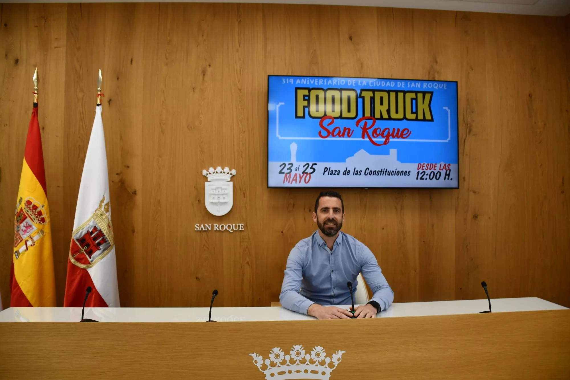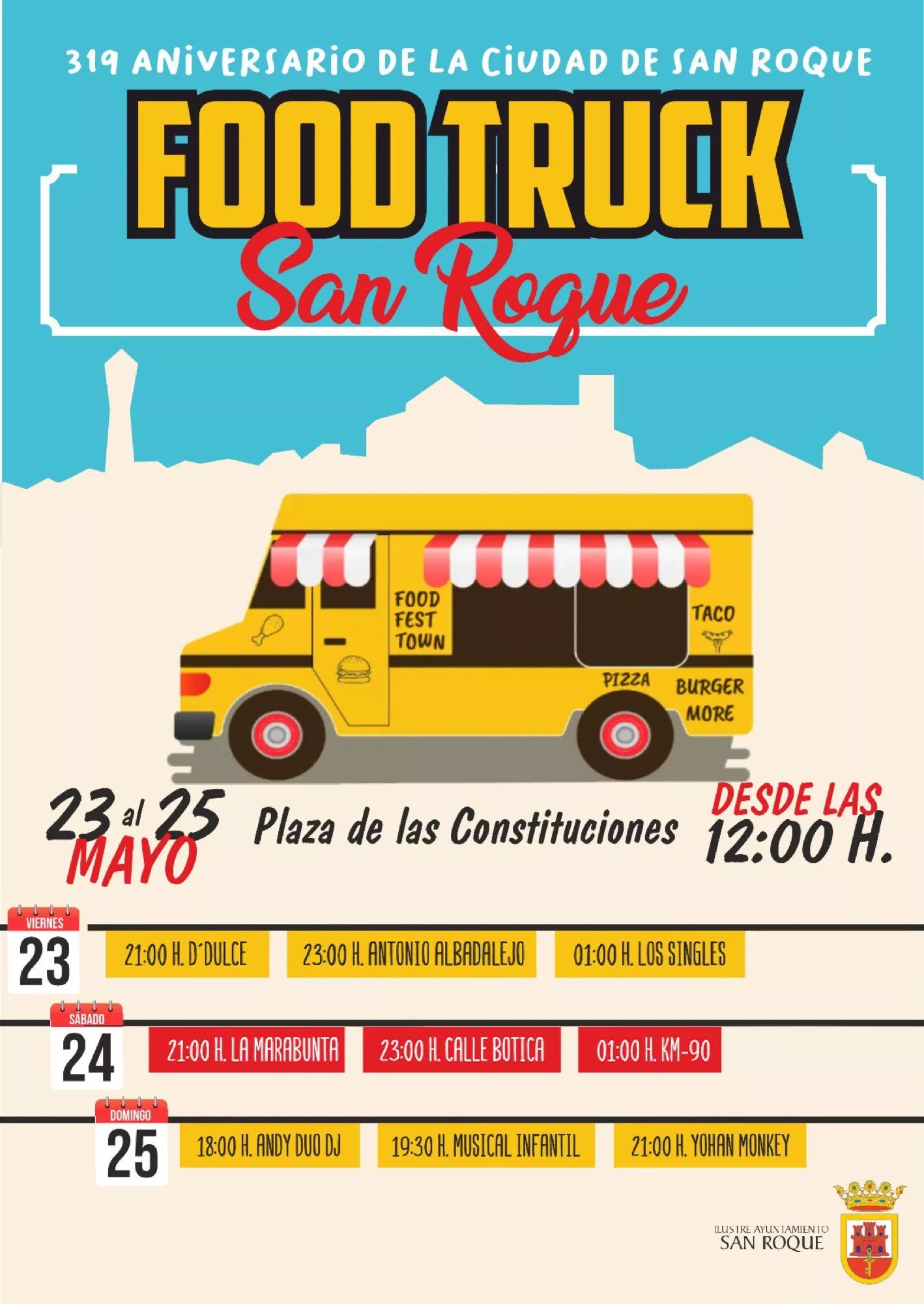 El municipio de San Roque cumple este mes de mayo el 319 Aniversario de su fundación y por este motivo el Ayuntamiento ha organizado distintos actos. Así, además del tradicional Pleno Institucional de Honores y Distinciones, el viernes 23 y el sábado 24 habrá actuaciones en la Plaza de las Constituciones, donde también se podrá disfrutar de una amplia oferta de “Foodtrucks”, mientras que el domingo se representará un musical infantil en el teatro.
