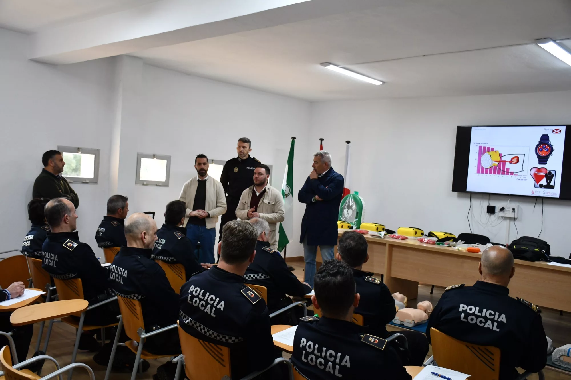 Los tenientes de alcalde de Seguridad Ciudadana y Deportes, David Ramos y Fernando Vega, han saludado este lunes al personal de Policía Local y de la Delegación de Deportes que asistía a un curso sobre el uso de desfibriladores. Tanto los aparatos como la formación habían sido solicitados por la plantilla policial, una petición que fue elevada al Equipo de Gobierno por la Junta de Personal, por lo que al acto asistieron también el presidente de dicho órgano, Juan Carlos Crespo, y el jefe de la Policía Local, Rubén Pérez.