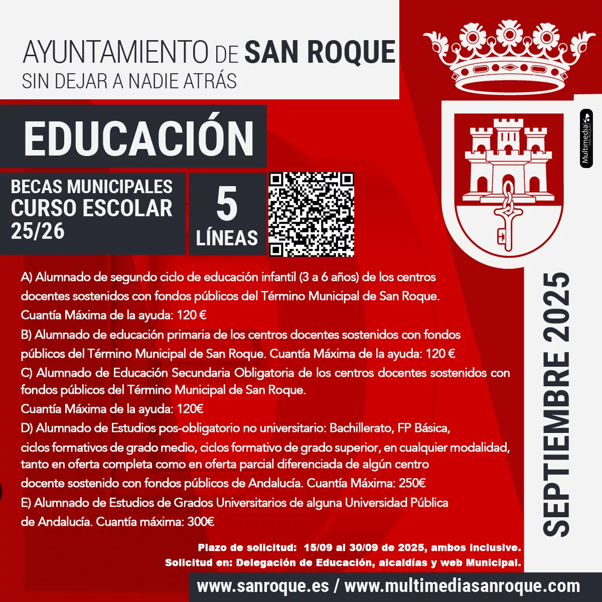 La Delegación de Educación del Ayuntamiento de San Roque pone en marcha de nuevo las cinco líneas de becas para estudiantes sanroqueños durante el curso 2025/26. Con una partida de casi 120.000 euros, las solicitudes para estas ayudas deberán presentarse del 15 al 30 de septiembre de 2025, coincidiendo con el inicio de las clases en la mayoría de las enseñanzas públicas.