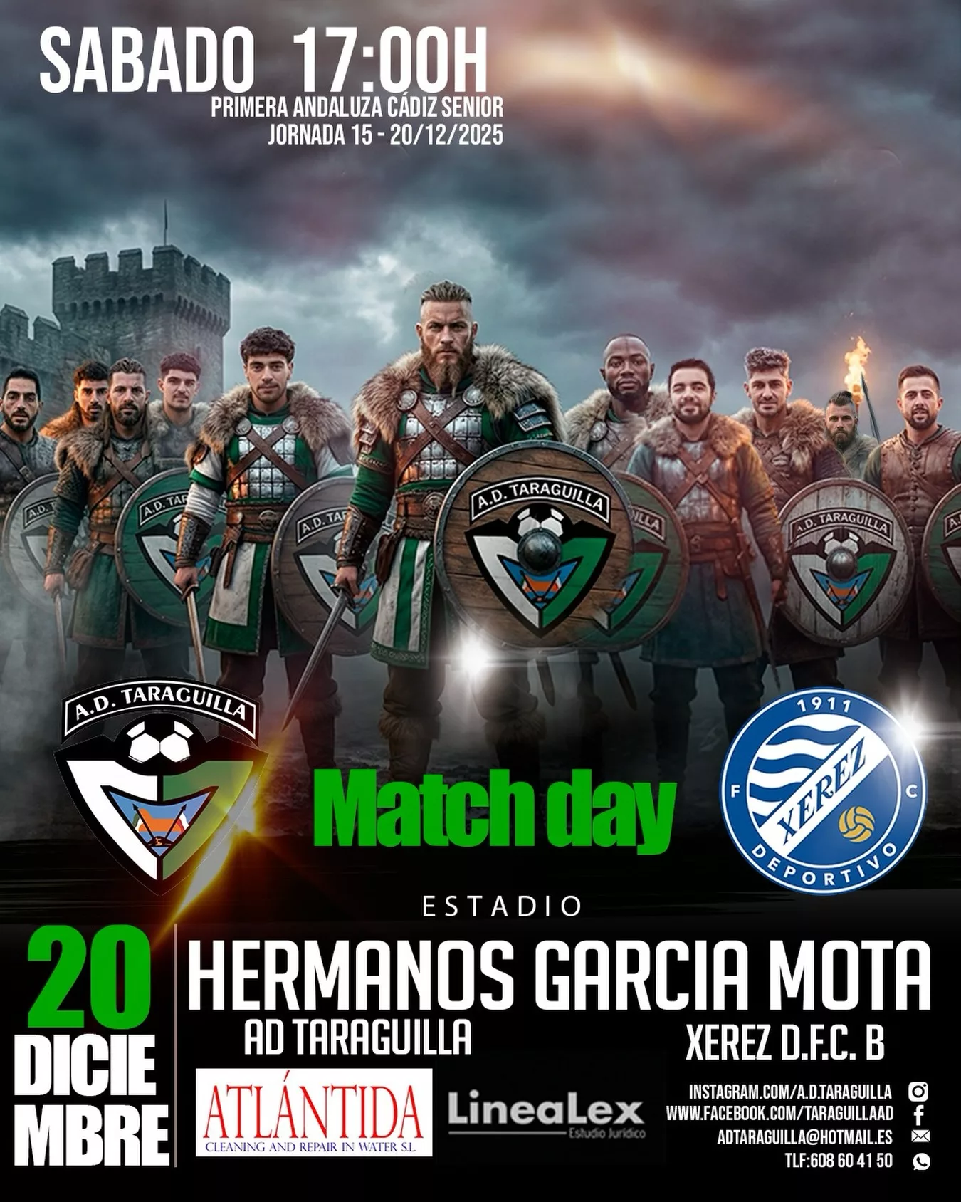 El próximo sábado 20 de diciembre la Agrupación Deportiva Taraguilla se enfrentará al Xerez Deportivo Fútbol Club, siendo esta disputa la última jornada de Liga correspondiente a la primera vuelta en Primera Andaluza Cádiz. El encuentro será en el complejo deportivo Hermano García Mota a las 17:00 horas.