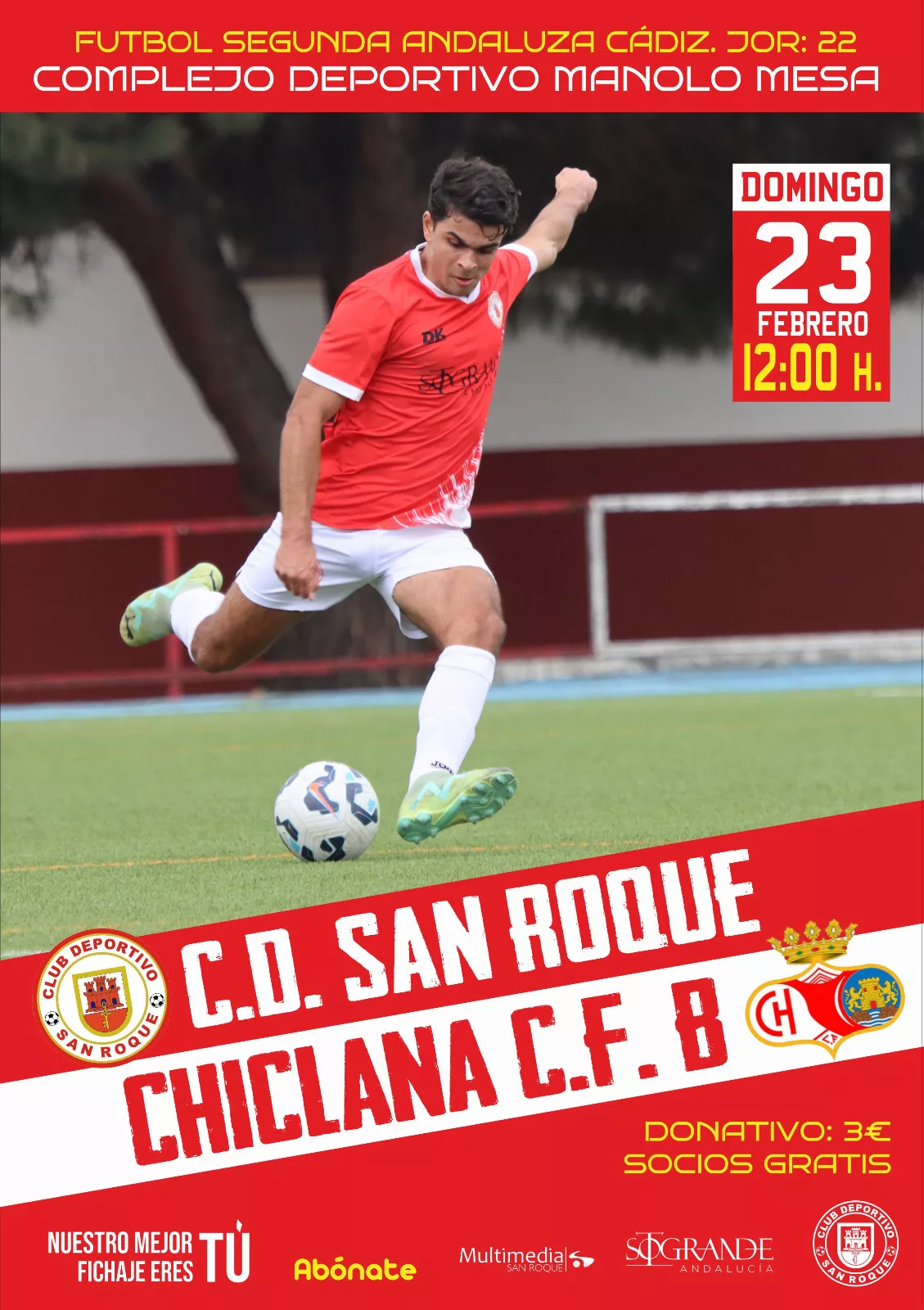 Todos los aficionados del CD San Roque tienen una cita este próximo domingo en el Manolo Mesa al mediodía para animar a su equipo. Los rojillos jugarán la jornada 22 en Segunda Andaluza Cádiz enfrentándose al Chiclana CF «B».
