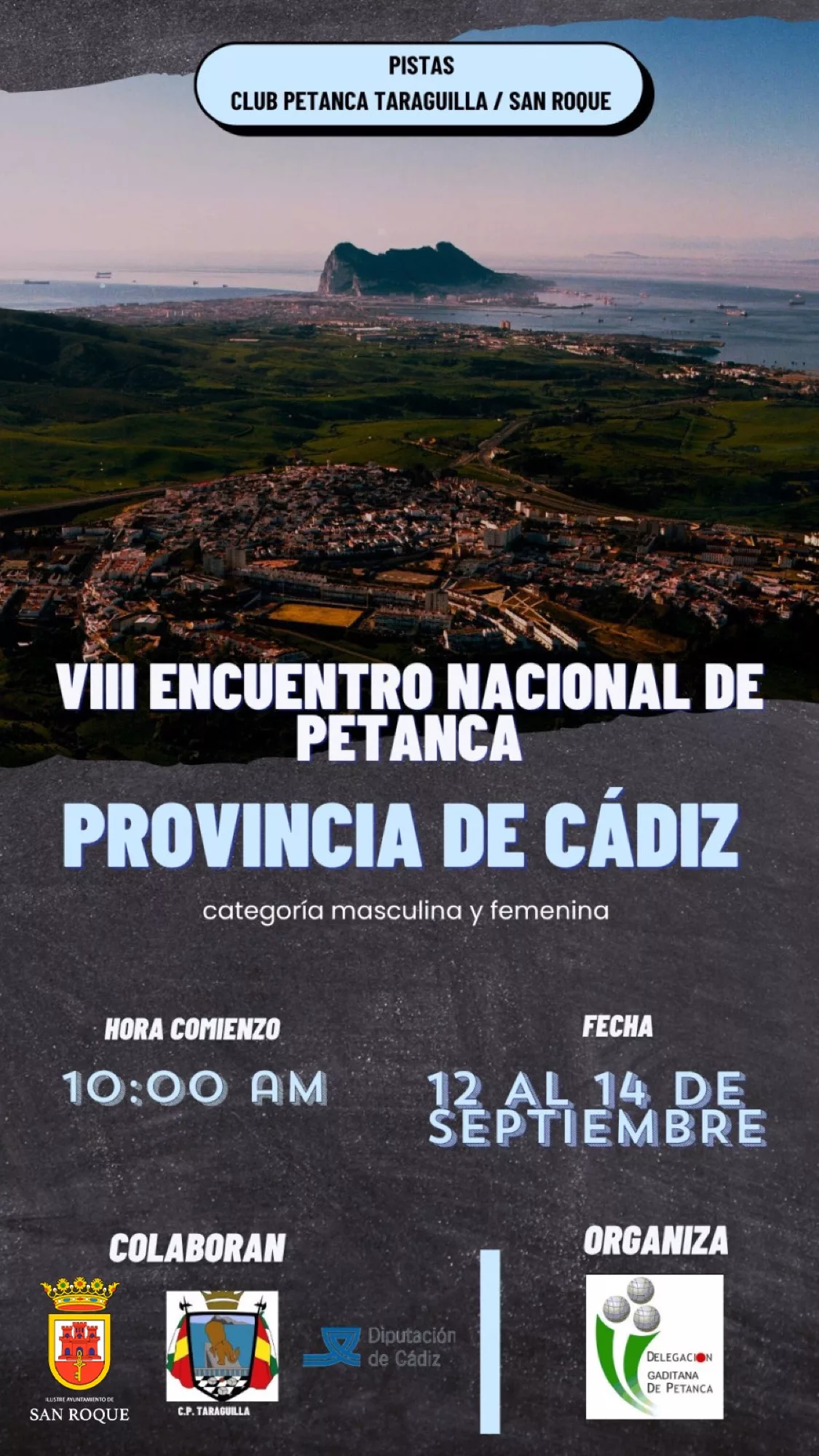 La Delegación Gaditana de Petanca organiza el VIII Encuentro Nacional de Petanca Provincia de Cádiz, una competición que se desarrollará este fin de semana en las pistas del Club Petanca Taraguilla. Colabora la entidad deportiva taraguillera, el Ayuntamiento de San Roque y la Diputación de Cádiz.