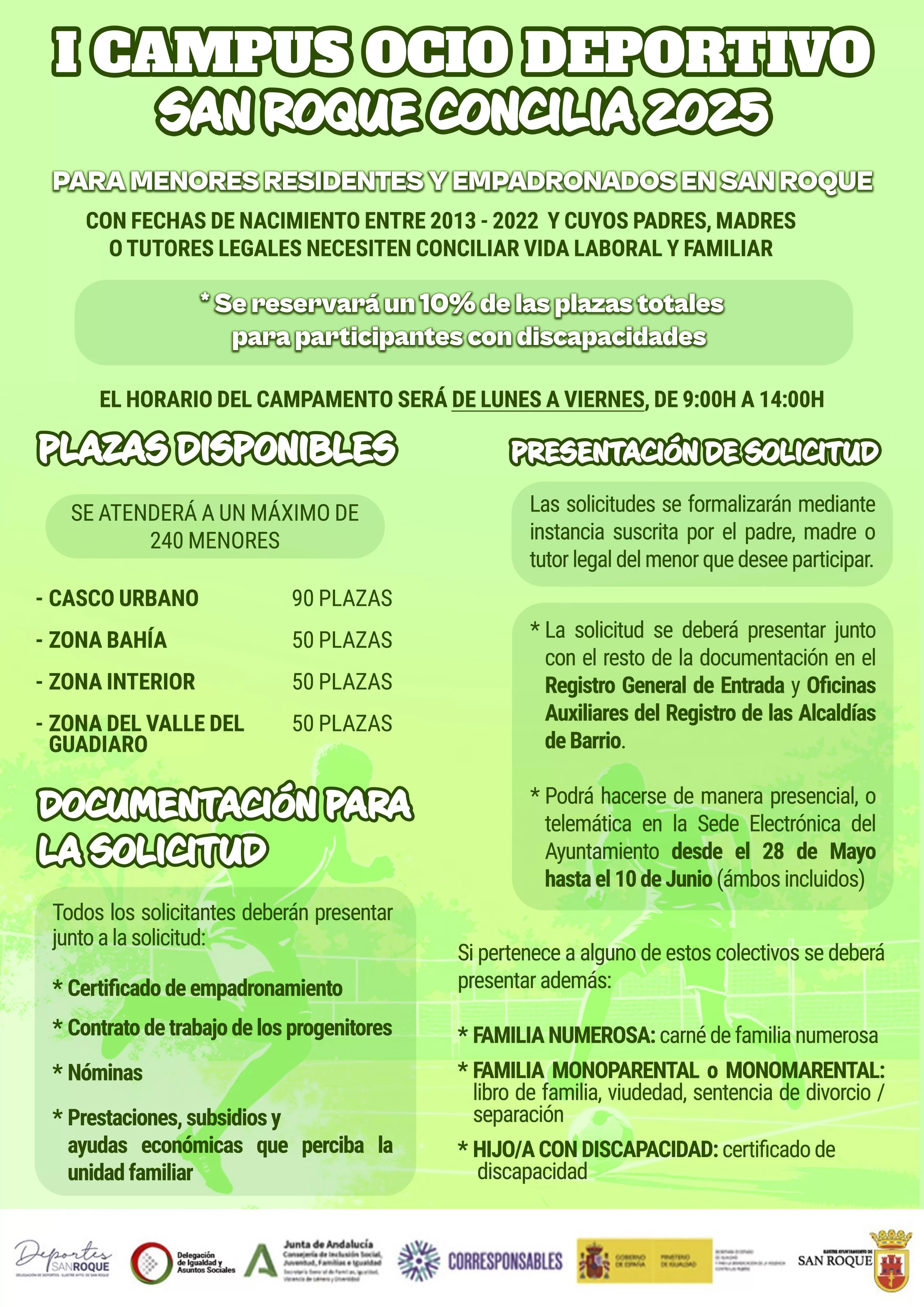 Los menores beneficiados por este I Campus Ocio Deportivo San Roque Concilia 2025, y nacidos entre 2013 y 2022, deberán ser residentes y empadronados en San Roque, y sus padres madres o tutores legales deban necesitar conciliar la vida laboral y familiar, por lo que deben demostrar con nóminas que están trabajando. El horario del campamento será de lunes a viernes de 09:00 a 14:00 horas.
