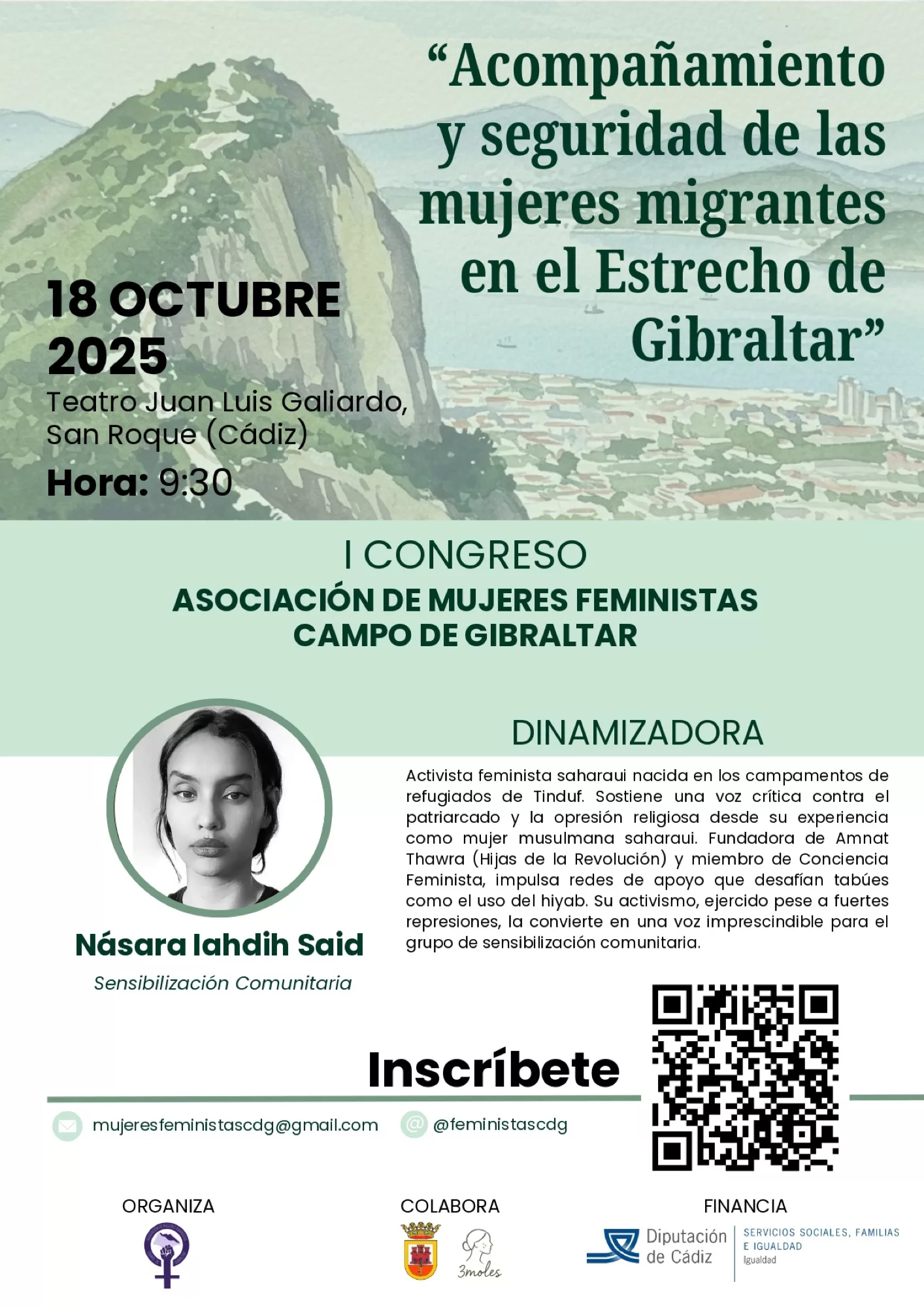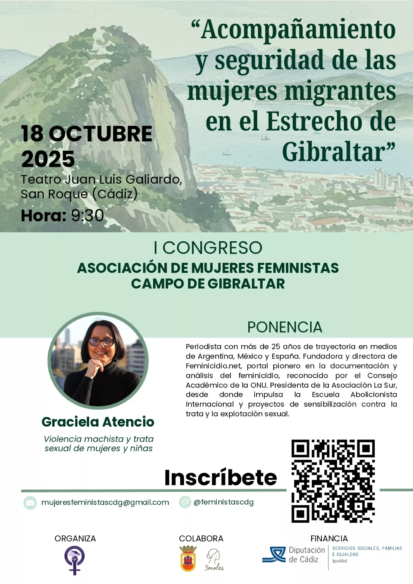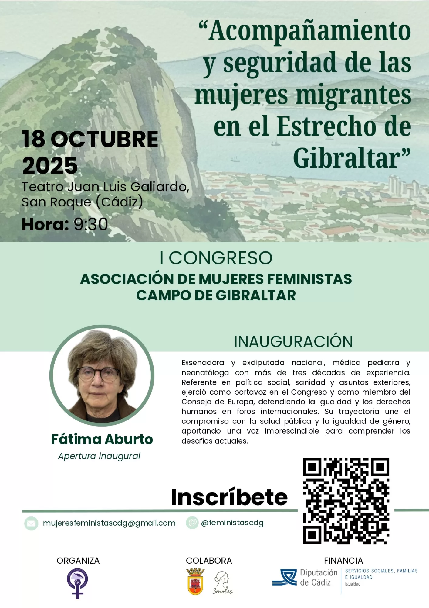La Asociación de Mujeres Feministas Campo de Gibraltar, con la colaboración del Ayuntamiento de San Roque y contando con la financiación de la Delegación de Igualdad de la Diputación de Cádiz, organizan el I Congreso de la Asociación de Mujeres Feministas el próximo 18 de octubre en el Teatro Juan Luis Galiardo y en el Edificio Diego Salinas. Este encuentro se centrará en las dificultades a las que deben enfrentarse las mujeres migrantes que llegan a la comarca, desde la discriminación por raza y género hasta la trata y la prostitución.