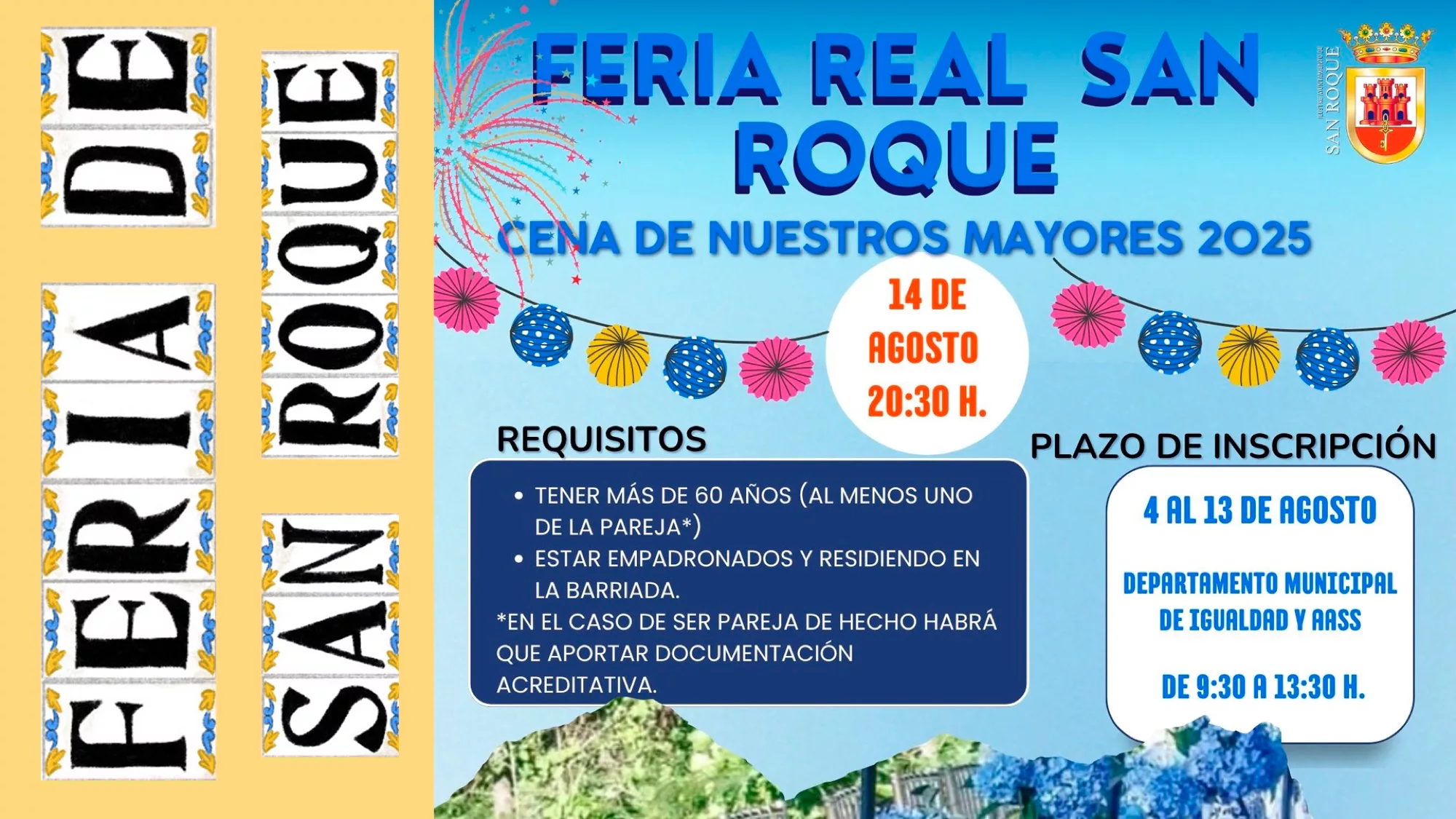 Desde el 4 al 13 de agosto estará abierto el plazo para que los mayores de San Roque Ciudad se inscriban en la Cena de Feria, que tendrá lugar el jueves 14 a las 20:30 horas en la caseta municipal.