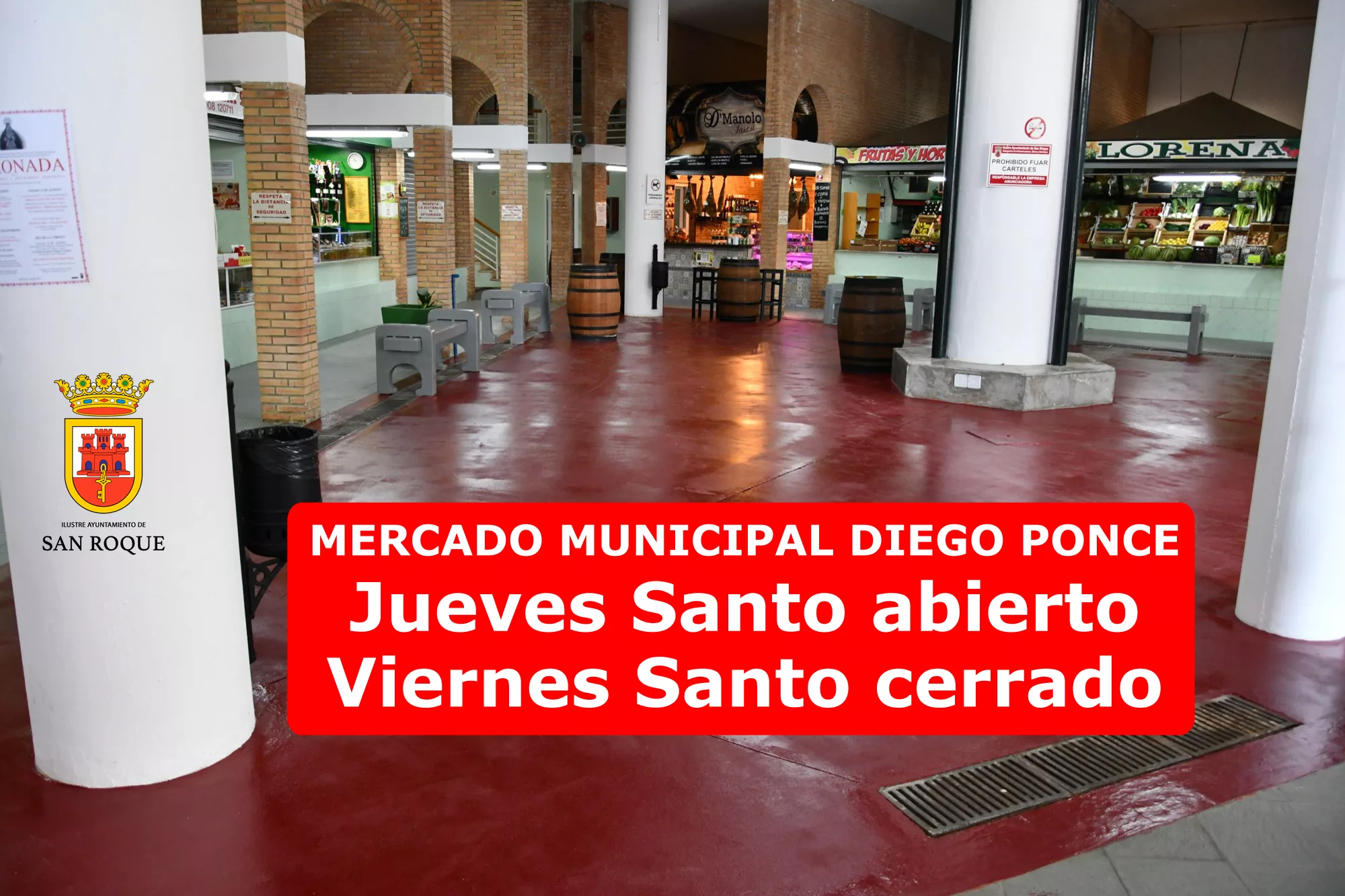 El Ayuntamiento de San Roque, a través de la Delegación de Mercados, que dirige el teniente de alcalde David Ramos, informa a los vecinos y usuarios del Mercado Municipal Diego Ponce sobre la apertura y cierre previstos para los días de Semana Santa. Este Jueves Santo abrirá y el Viernes Santo permanecerá cerrado.