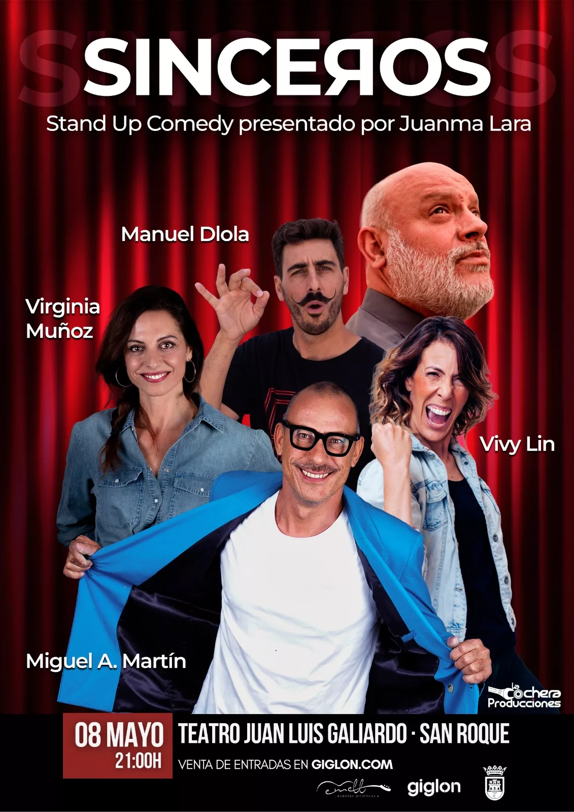 El espectáculo está presentado por Juanma, Lara, y en el mismo intervendrán Virginia Muñoz, Manuel Dlola, Vivy Lin, y Miguel Angel Martín. Viene de la mano de la compañía malagueña La Cochera Producciones, y es una apuesta por los tradicionales monólogos de la mano de actores andaluces.