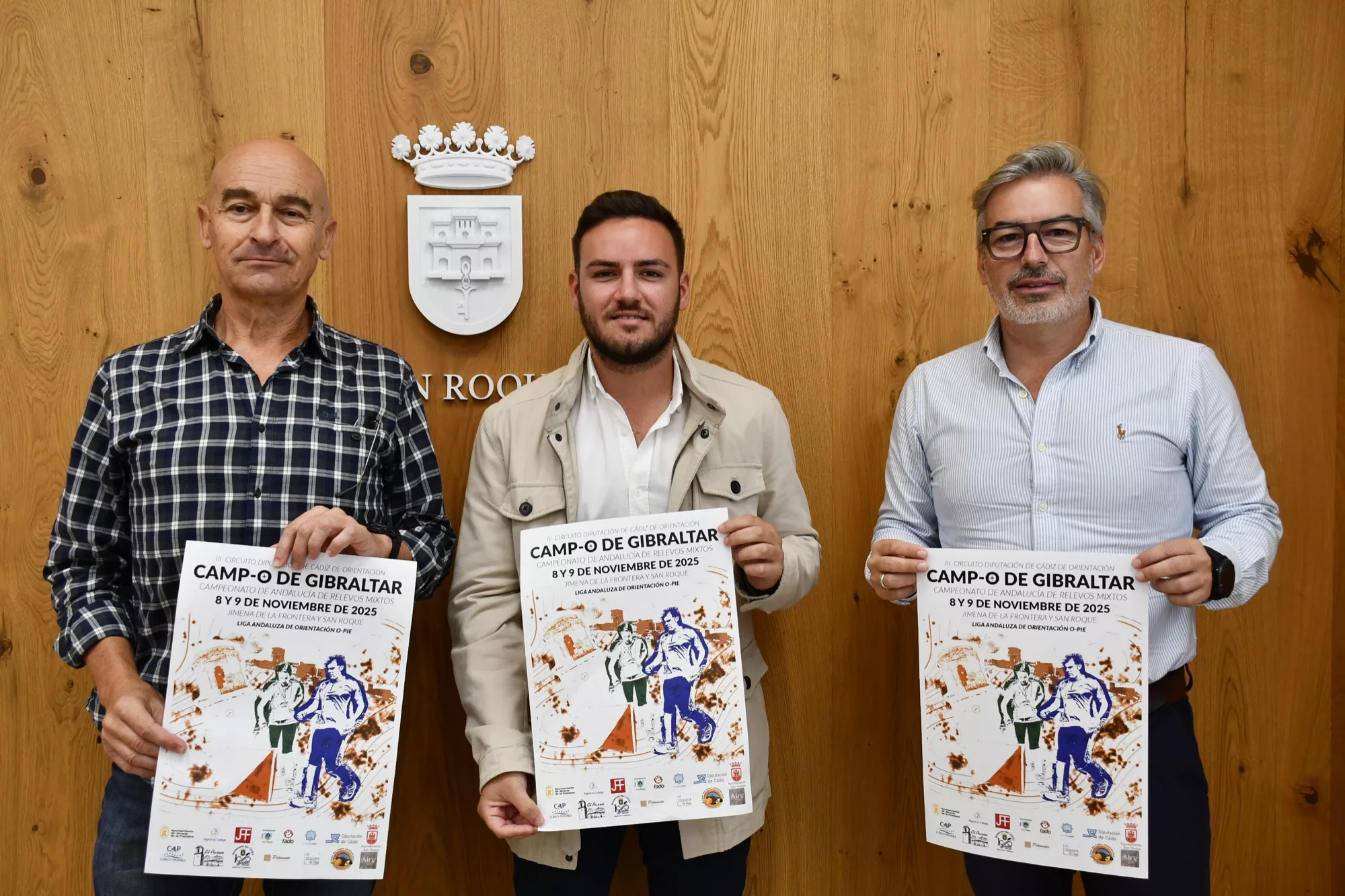 El teniente de alcalde delegado de Deportes, Fernando Vega, ha presentado este jueves la prueba Camp-O de Gibraltar, que se disputará este domingo en el Pinar del Rey y el sábado en Jimena de la Frontera. También participaron en la presentación el director del Servicio de Deportes, Juan Carlos Crespo, y Ángel Sáez, representante del Colegio Los Pinos de Algeciras, uno de los organizadores de esta competición junto a la Delegación de Deportes del Ayuntamiento de San Roque y la Federación Andaluza del Deporte de Orientación.