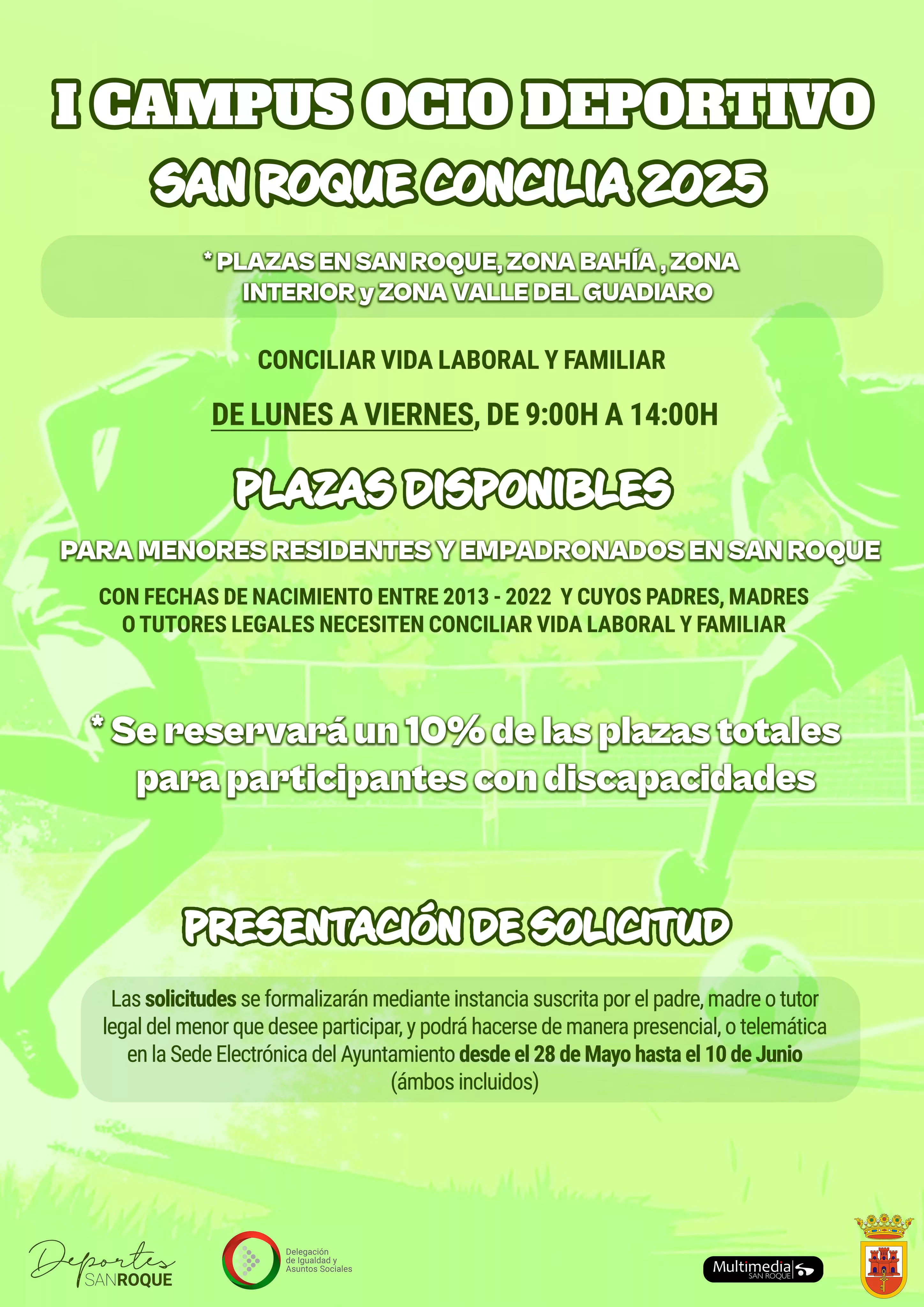 Los menores beneficiados por este I Campus Ocio Deportivo, San Roque Concilia 2025, y nacidos entre 2013 y 2022, deberán ser residentes y empadronados en San Roque, y sus padres madres o tutores legales deban necesitar conciliar la vida laboral y familiar. El horario del campamento será de lunes a viernes de 09:00 a 14:00 horas.