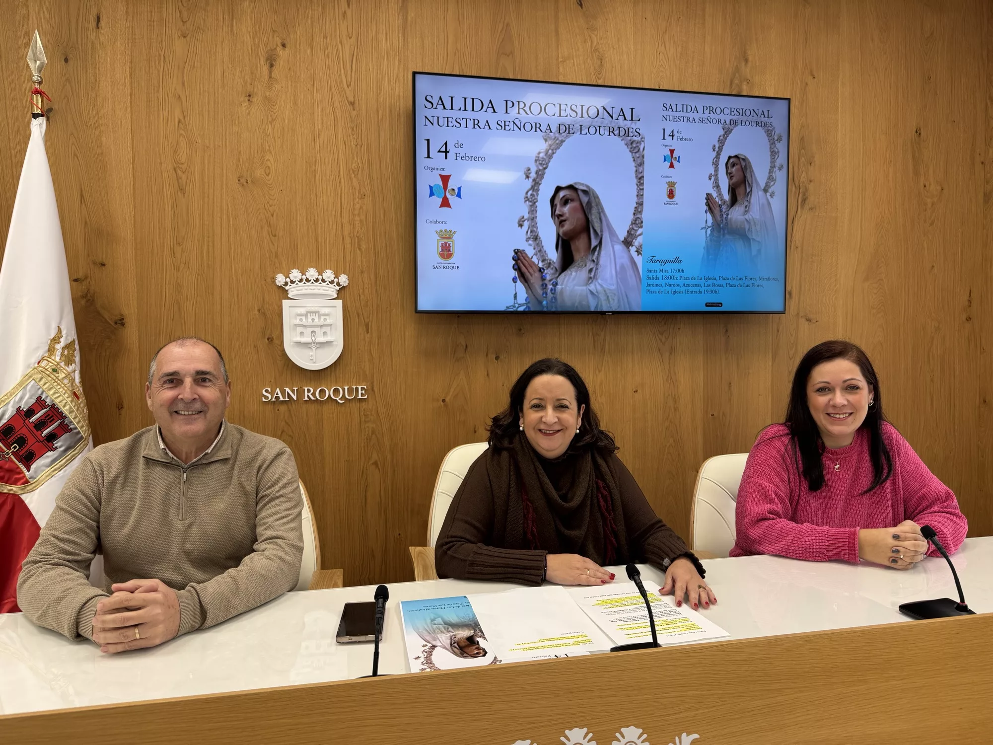 La teniente de alcalde de Tradiciones, María del Mar Collado, y el teniente de alcalde de la zona interior, Juan Serván, junto a la secretaria de la Asociación Parroquial de Nuestra Señora de Lourdes, Raquel Díaz, han presentado la iniciativa.