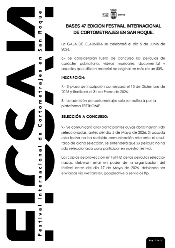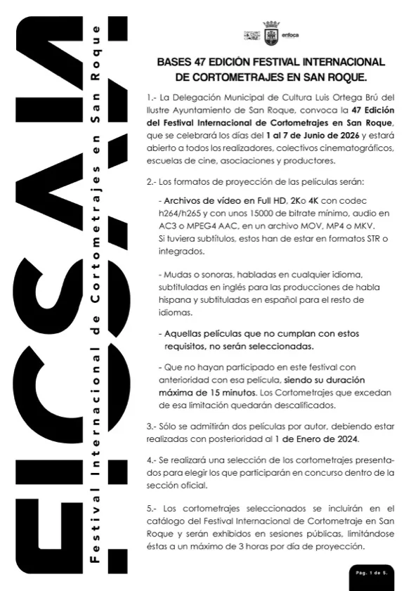 En las bases de la 47 Edición del Festival Internacional de Cortometrajes en San Roque se recoge que se celebrará del 1 y el 7 de junio de 2026 y que estará abierto a todos los realizadores, colectivos cinematográficos, escuelas de cine, asociaciones y productores. El plazo de inscripción de películas comenzó el 15 de diciembre de 2025 y finalizará el 31 de enero de 2026.