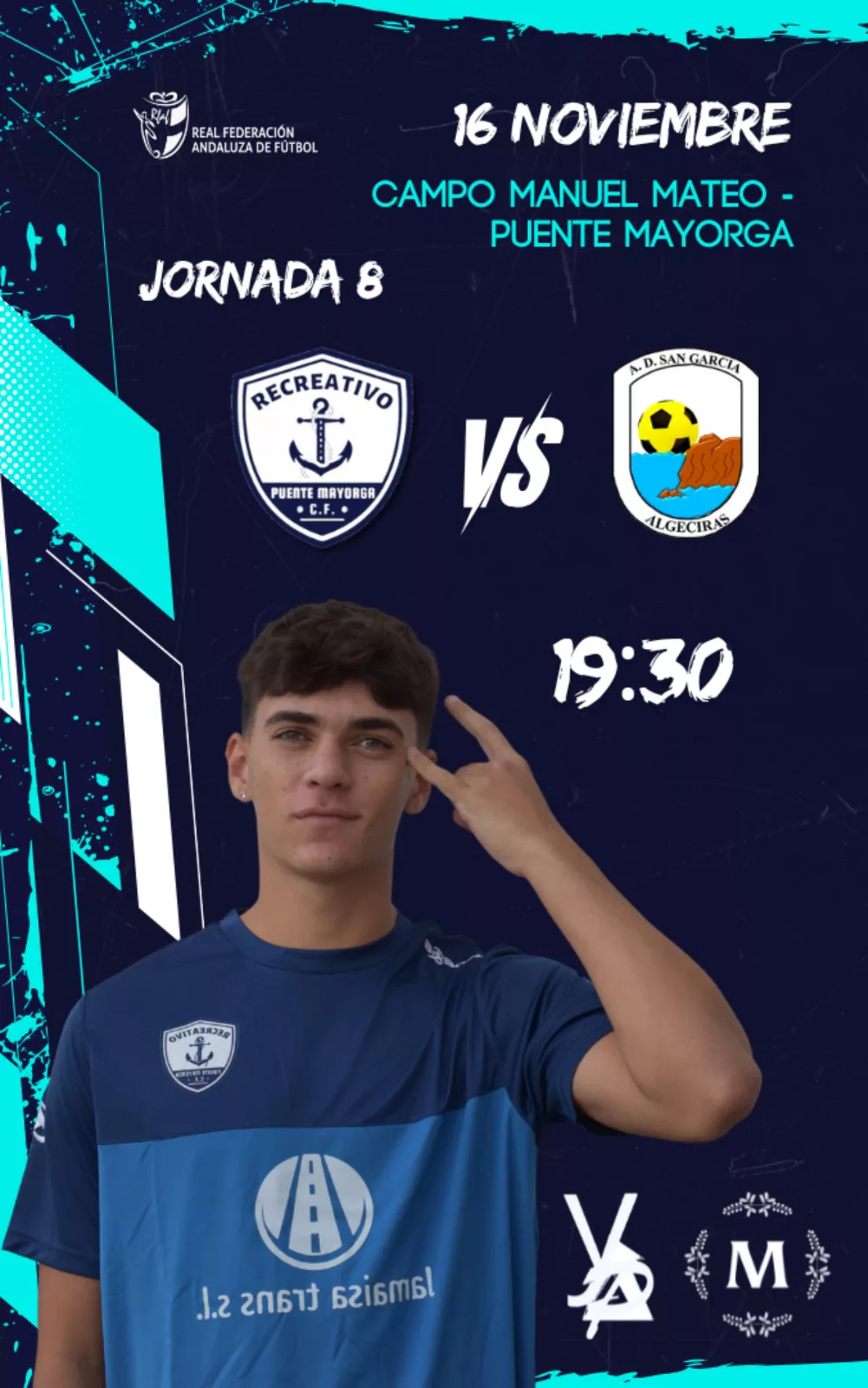El Recreativo Puente Mayorga Club de Fútbol recibirá en casa a la Agrupación Deportiva San García, este sábado a las 19.30 horas en el Municipal Manuel Mateo en la octava jornada de Tercera Andaluza Cádiz, Grupo 2.