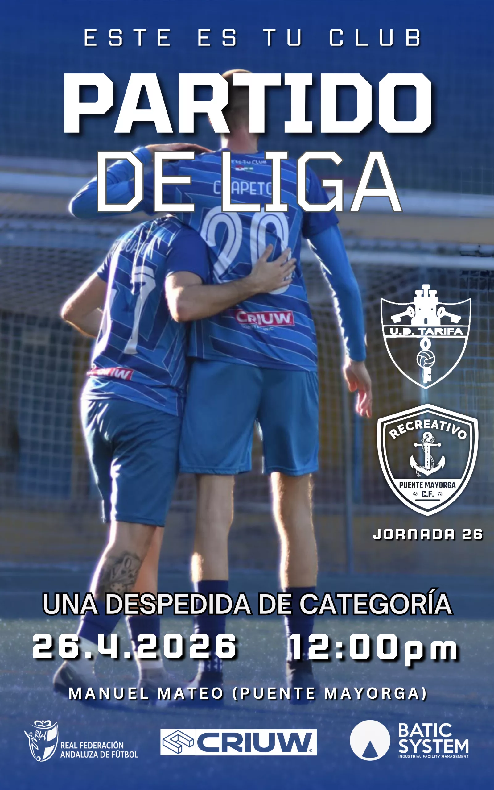 Recreativo Puente Mayorga Club de Fútbol hace una despedida “de categoría” de la liga en Tercera Andaluza como líder y ya ascendido, con el último envite en su casa, ante el filial de la Unión Deportiva Tarifa, este domingo a mediodía.