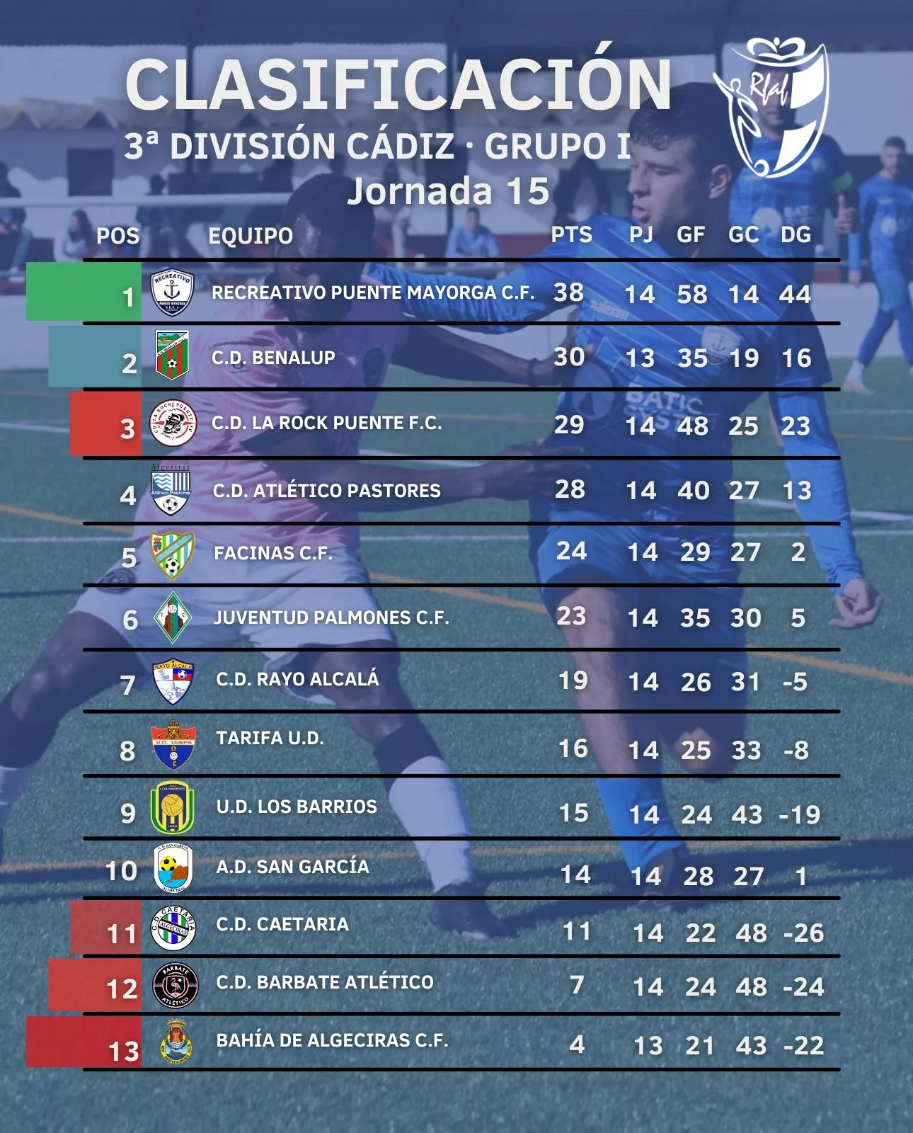 La jornada 15 de Tercera Andaluza Cádiz Grupo 1 se jugó el pasado domingo con el encuentro entre el Recreativo Puente Mayorga y el Juventud Palmones en el campo Manuel Mateo, el resultado un empate que hace que el Recreativo se mantenga invicto en la liga.