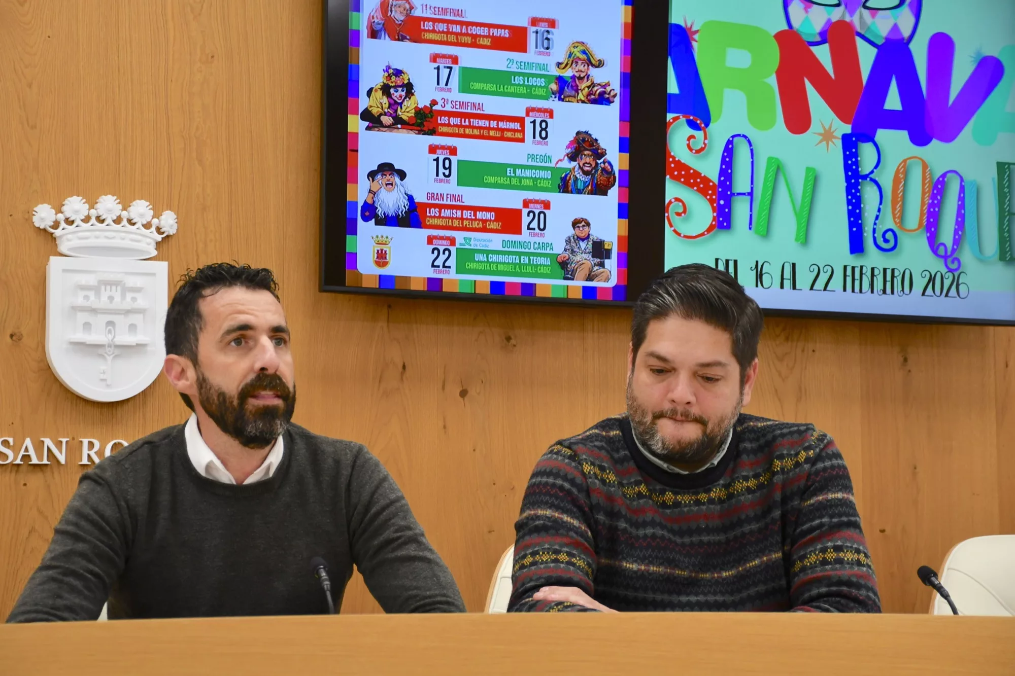 El teniente de alcalde de Juventud y Comercio, David Ramos, junto al delegado de Fiestas, Abel Heredia, han presentado los eventos que el sábado 21 se suman a la agenda del Carnaval de la Ciudad de San Roque 2026.