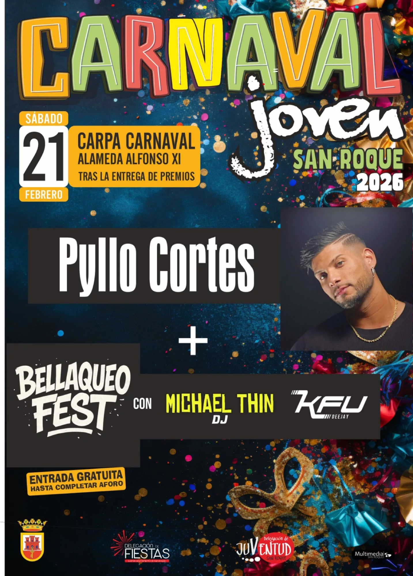 La fiesta del Carnaval Joven será en la carpa situada en la Alameda Alfonso XI y está dirigida principalmente al público juvenil. Contará con la actuación de Pyllo Cortés y el Bellaqueo Fest a cargo de Michael Thin y KFU Deejay. Ramos recordó que esta actividad es totalmente gratuita y animó a los vecinos a disfrutar de la música y el ritmo mientras se celebra el Carnaval en San Roque.