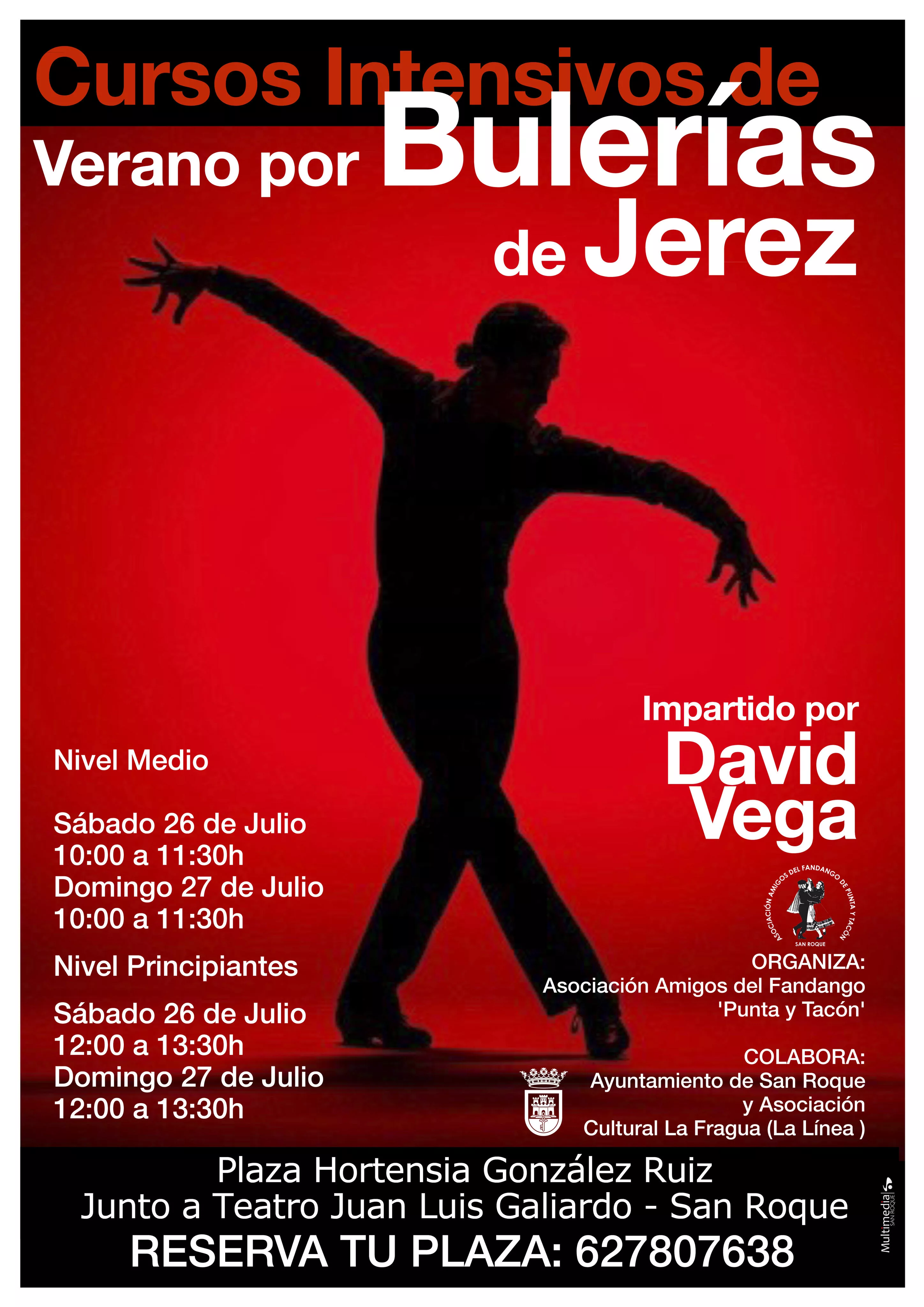 El Ayuntamiento de San Roque colabora con la Asociación Amigos del Fandango «Punta y Tacón» organizadora de los cursos intensivos de verano por Bulerías de Jerez, que tendrán lugar los días 26 y 27 de julio en la Plaza Hortensia González Ruiz, junto al Teatro Juan Luis Galiardo.
