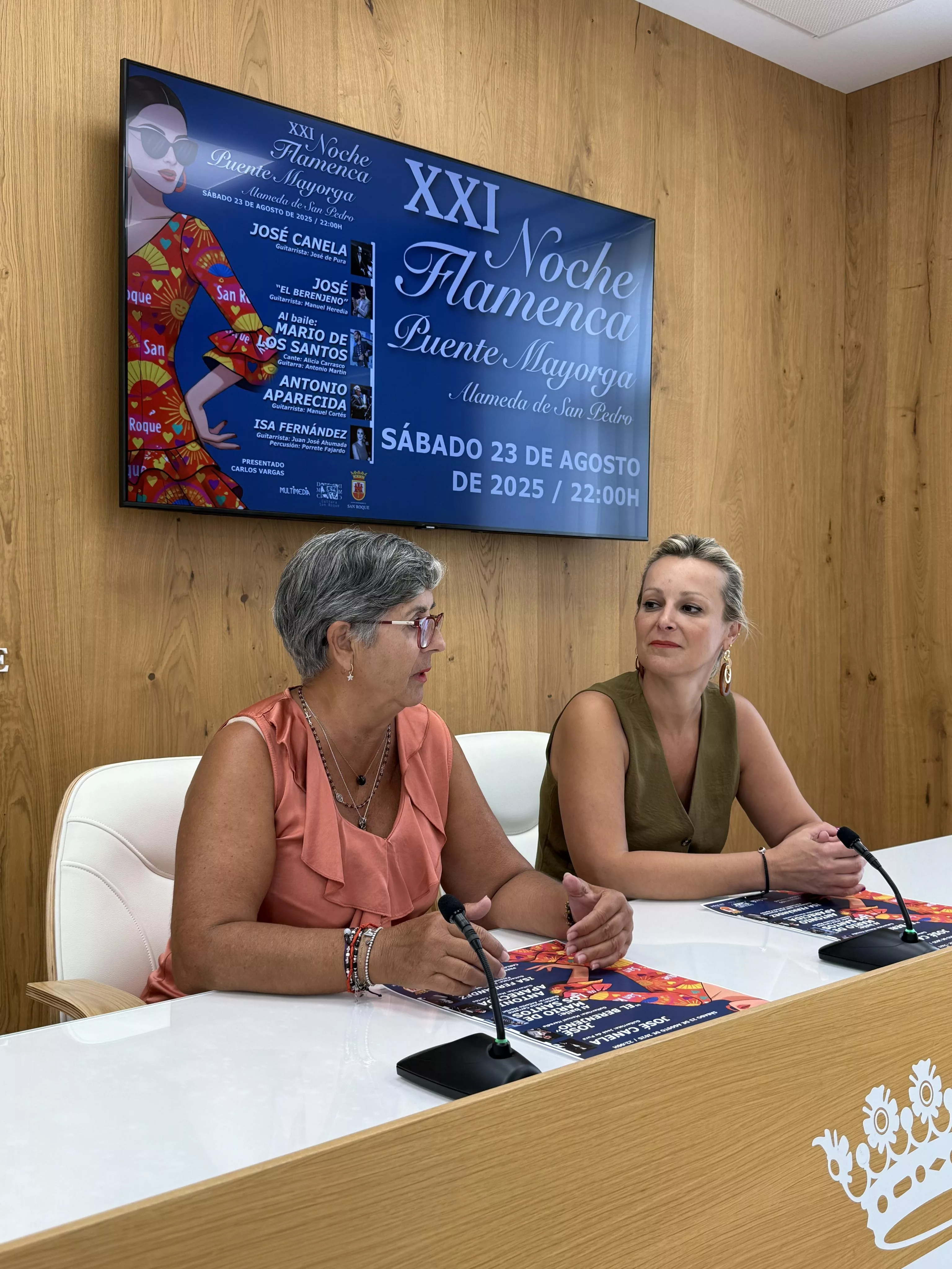 La teniente de alcalde de Cultura, Ana Ruiz, y la presidenta de la Asociación de Vecinos Puente Romano, María Jesús García Illescas, han presentado la XXI edición de la Noche Flamenca de Puente Mayorga, que tendrá lugar el próximo sábado 23 de agosto.