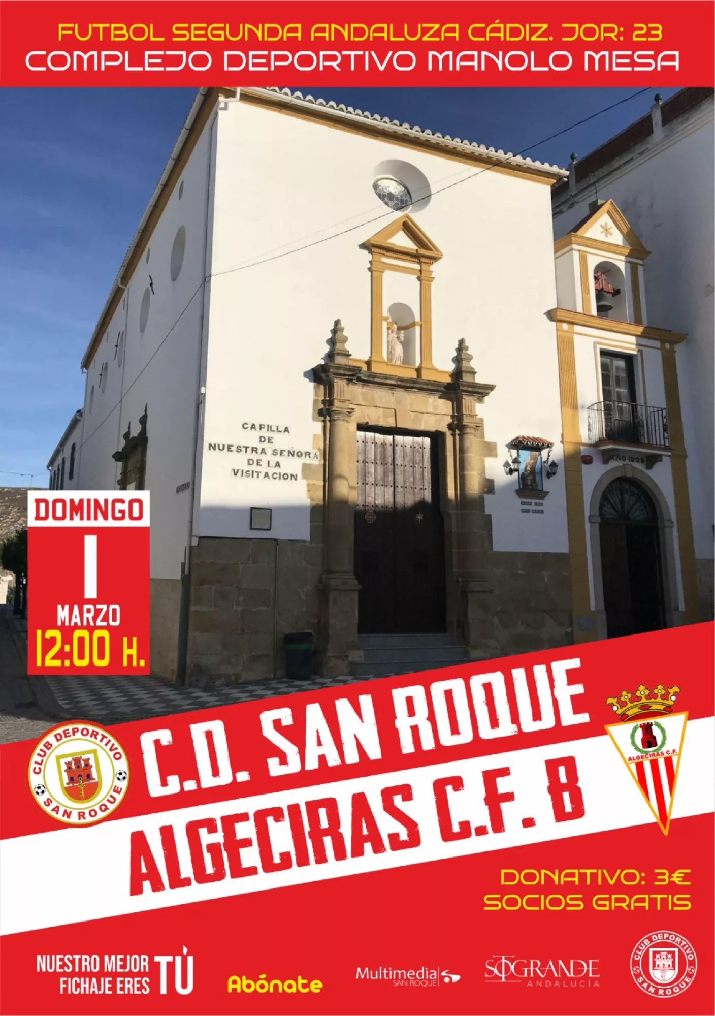El próximo domingo 1 de marzo al mediodía, se disputará el derbi comarcal entre el Club Deportivo San Roque y el Algeciras Club de Fútbol B en el complejo deportivo Manolo Mesa.