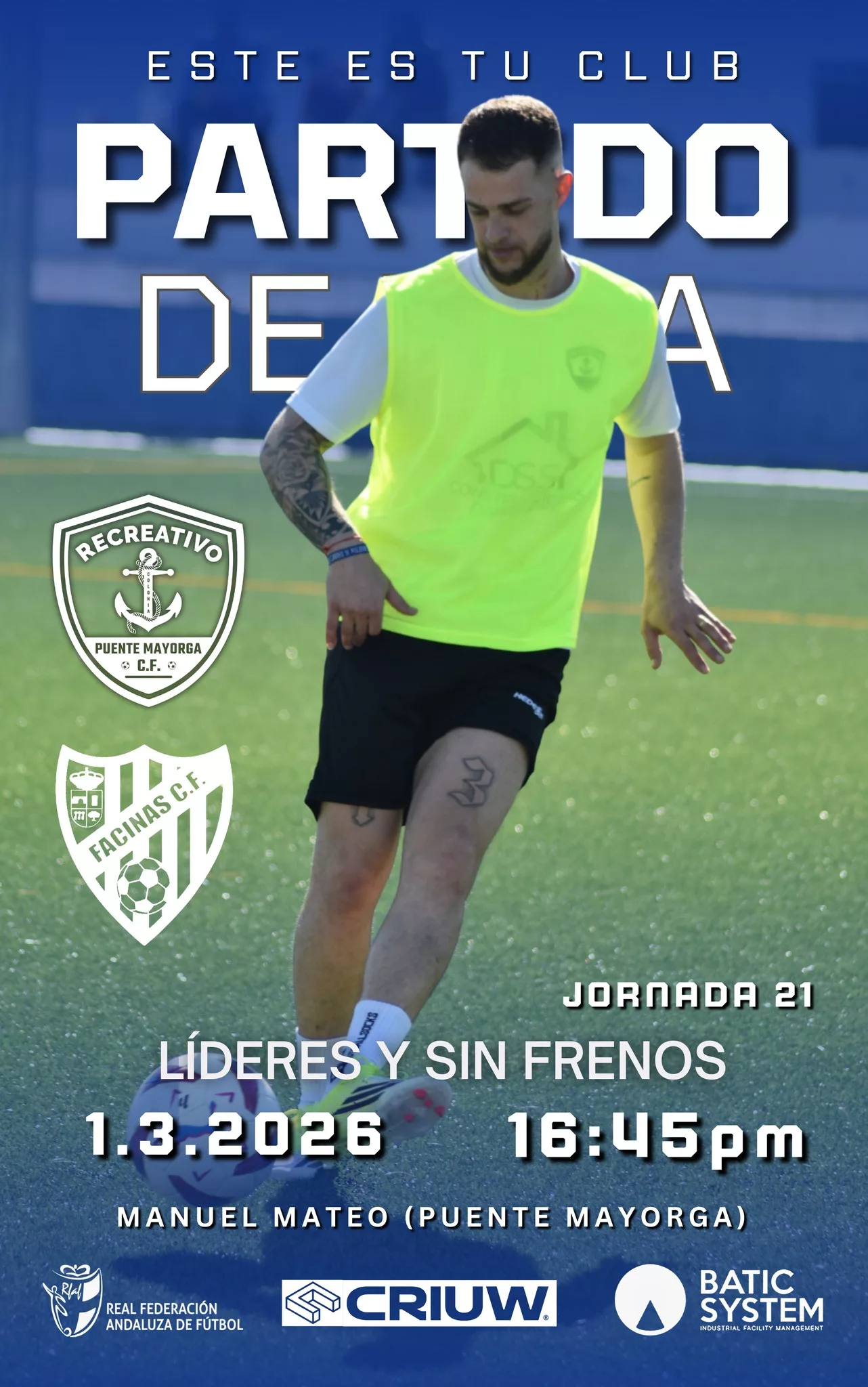 El partido de la jornada 21 de Tercera Andaluza gaditana, Grupo 1, enfrentará al Recreativo Puente Mayorga Club de Fútbol con el Facinas Club de Fútbol.
