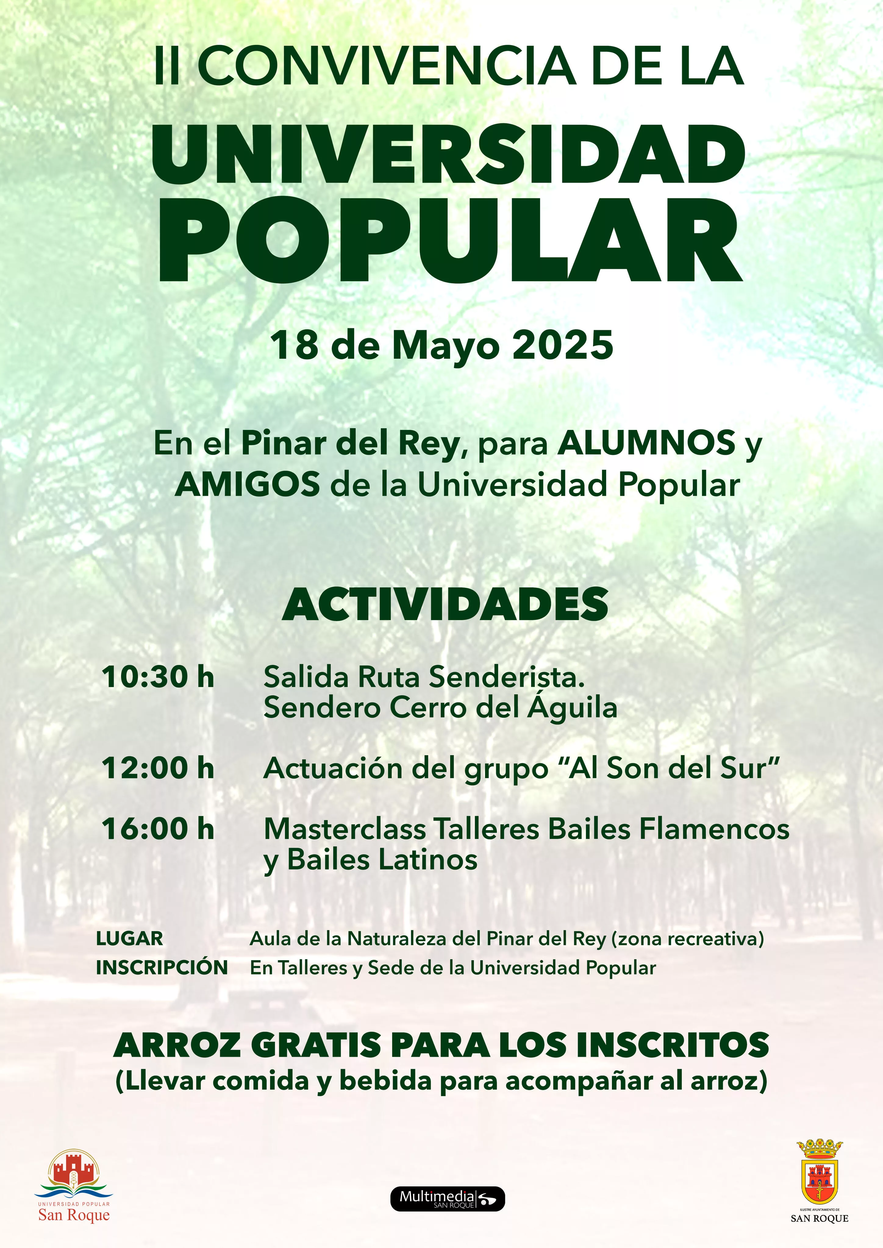 Con el objetivo de estrechar los lazos en la amplia familia de la Universidad Popular, el próximo 18 de mayo se celebrará en el Pinar del Rey la II Convivencia de la UP. El concejal delegado de dicho departamento, Fernando Vega, ha animado a apuntarse a la misma a los casi 3.000 inscritos en los talleres de este servicio del Ayuntamiento de San Roque.